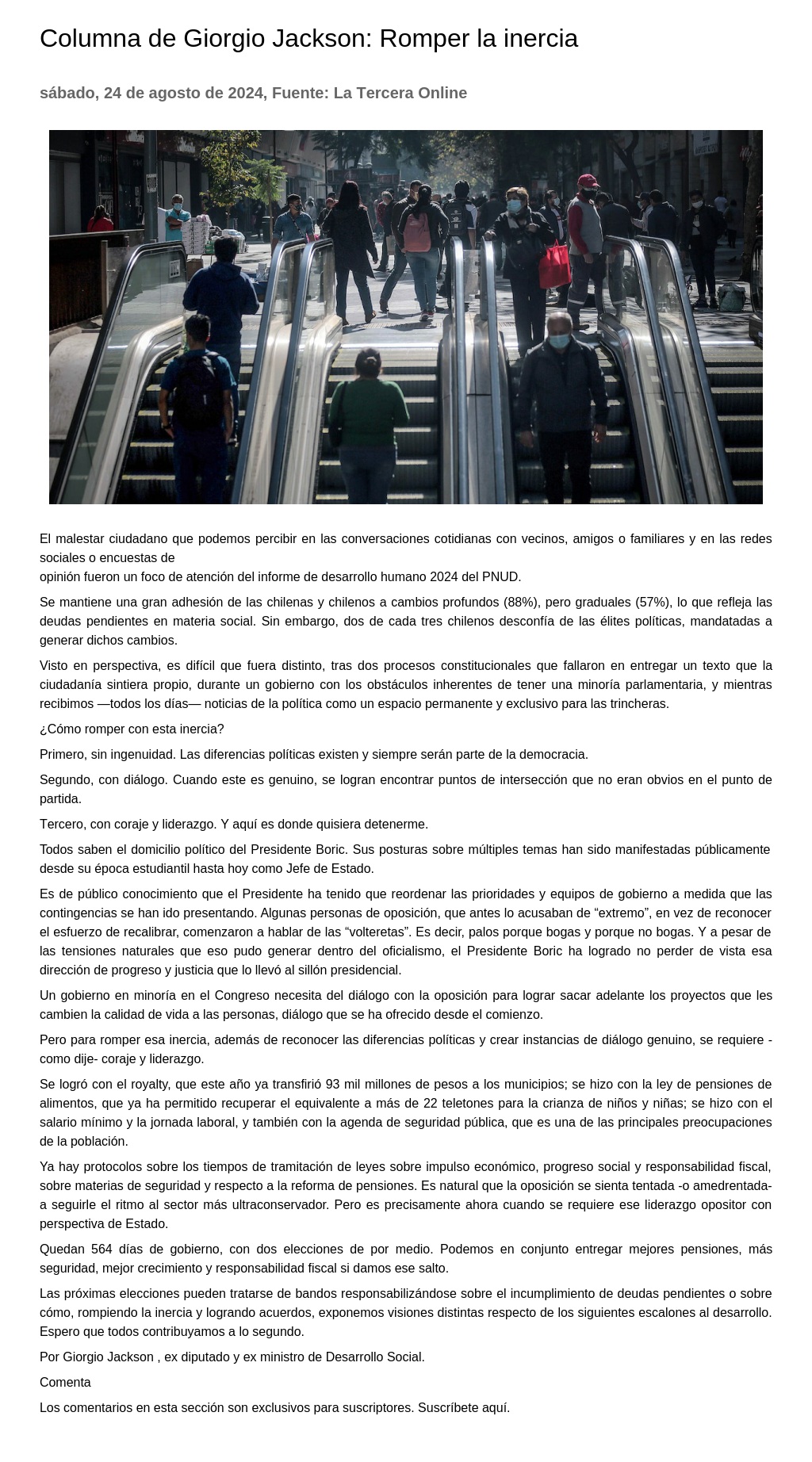 Columna de Giorgio Jackson: Romper la inercia 24-08-2024 La Tercera Online El malestar ciudadano que podemos percibir en las conversaciones cotidianas con vecinos, amigos o familiares y en las redes sociales o encuestas de opinión fueron un foco de atención del informe ... |
