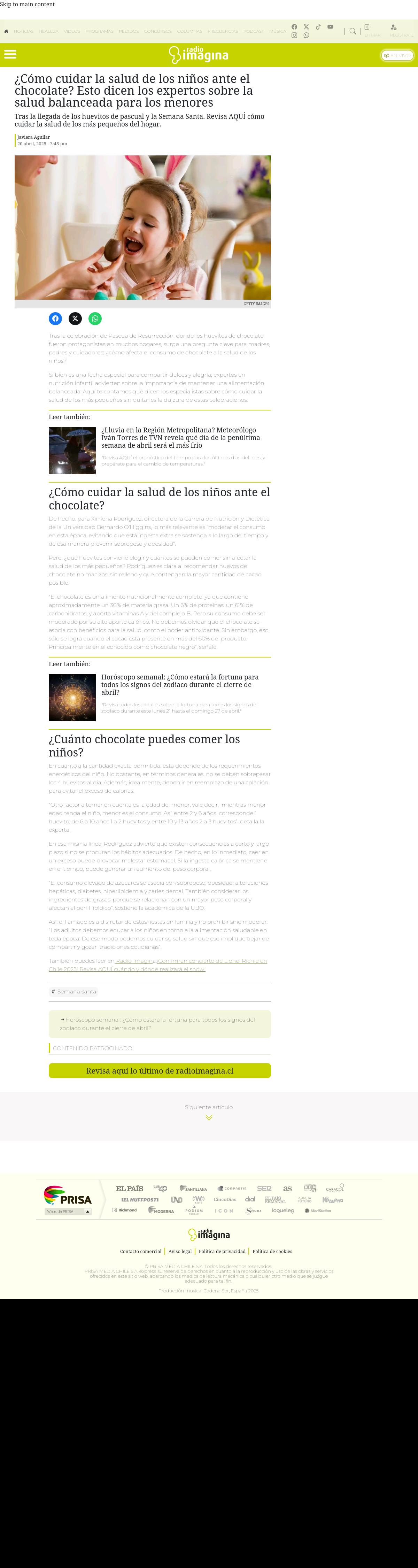 ¿Cómo cuidar la salud de los niños ante el chocolate? Esto dicen los expertos sobre la salud balanceada para los menores 20-04-2025 Radioimagina Tras la llegada de los huevitos de pascual y la Semana Santa. Revisa AQUÍ cómo cuidar la salud de los más pequeños del hogar. Tras la celebración de Pascua de Resurrección, donde los huevito... |