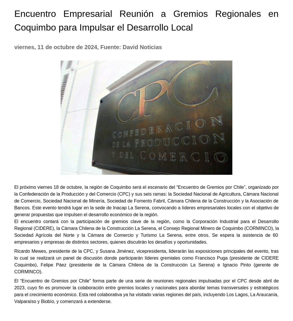 Encuentro Empresarial Reunión a Gremios Regionales en Coquimbo para Impulsar el Desarrollo Local 11-10-2024 David Noticias El próximo viernes 18 de octubre, la región de Coquimbo será el escenario del “Encuentro de Gremios por Chile”, organizado por la Confederación de la Producción y del Comercio (CPC) y sus seis rama... |