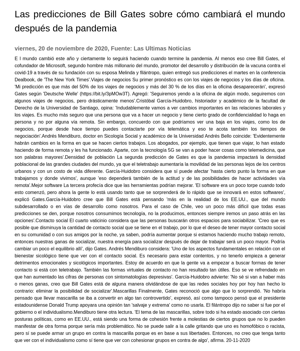 Las predicciones de Bill Gates sobre cómo cambiará el mundo después de la pandemia 20-11-2020 Las Ultimas Noticias E l mundo cambió este año y ciertamente lo seguirá haciendo cuando termine la pandemia. Al menos eso cree Bill Gates, el cofundador de Microsoft, segundo hombre más millonario del mundo, promot... |