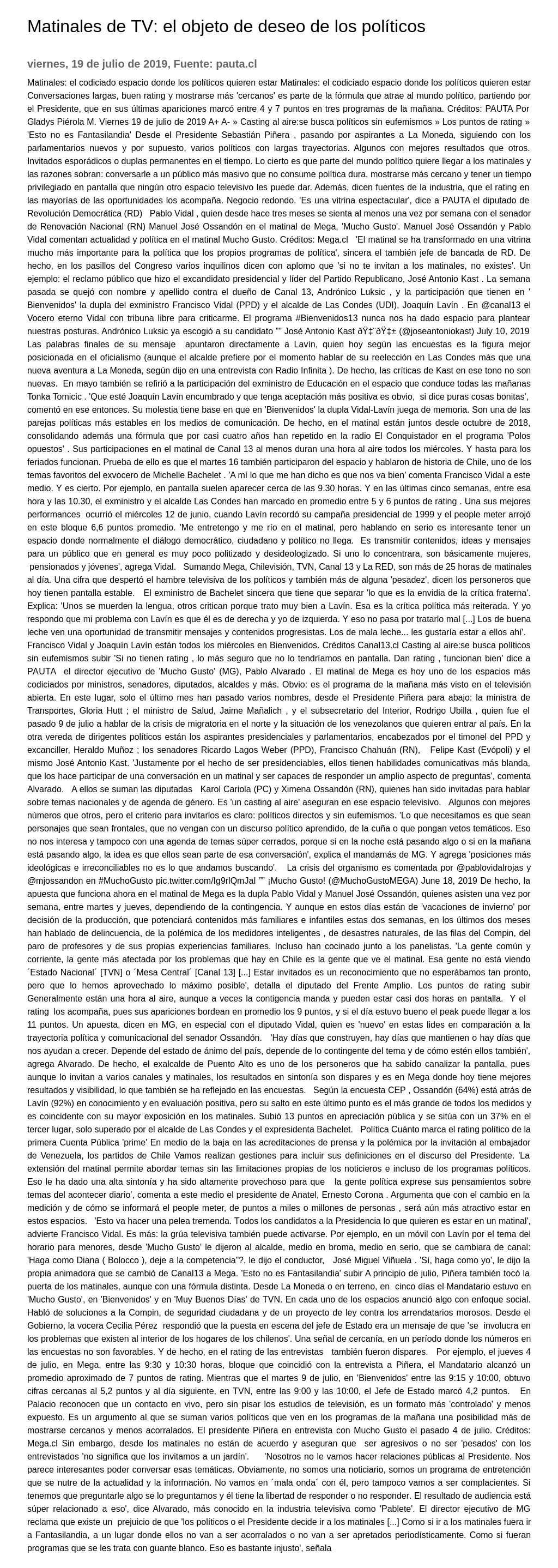 Matinales de TV: el objeto de deseo de los políticos 19-07-2019 pauta.cl Matinales: el codiciado espacio donde los políticos quieren estar Matinales: el codiciado espacio donde los políticos quieren estar Conversaciones largas, buen rating y mostrarse más "cercanos" es p... |