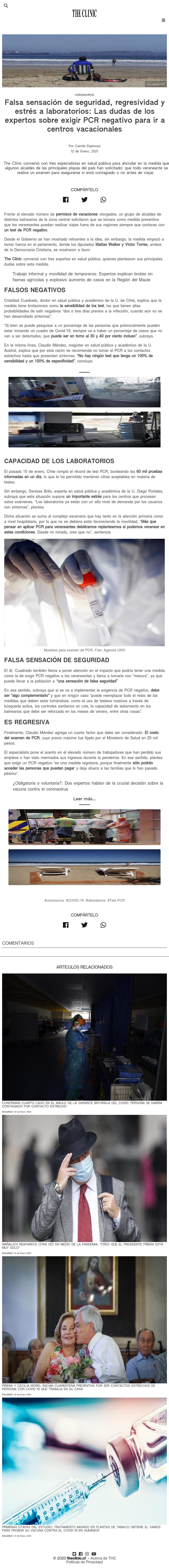 Falsa sensación de seguridad, regresividad y estrés a laboratorios: Las dudas de los expertos sobre exigir PCR negativo para ir a centros vacacionales 12-01-2021 The Clinic The Clinic conversó con tres especialistas en salud pública para ahondar en la medida que algunos alcaldes de las principales playas del país han solicitado: que todo veraneante se realice un examen ... |