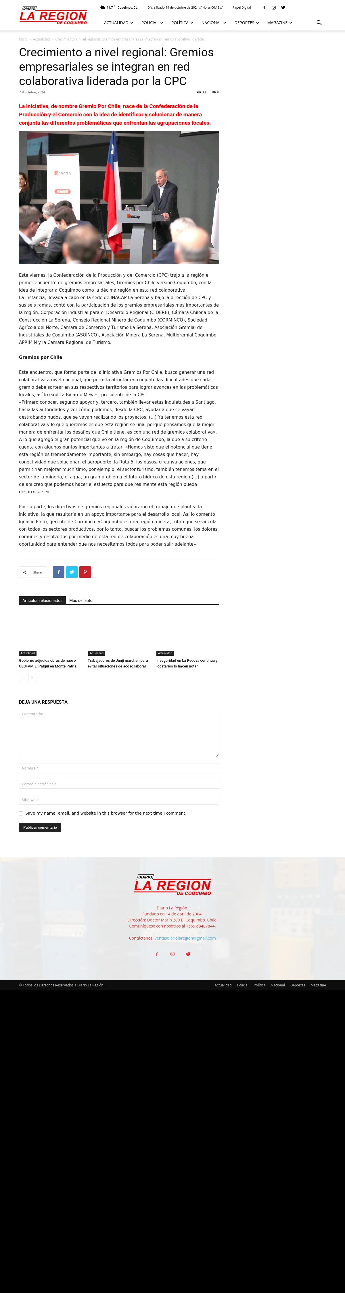 Crecimiento a nivel regional: Gremios empresariales se integran en red colaborativa liderada por la CPC 19-10-2024 [PRENSA]La Region La iniciativa, de nombre Gremio Por Chile, nace de la Confederación de la Producción y el Comercio con la idea de identificar y solucionar de manera conjunta las diferentes problemáticas que enfren... |