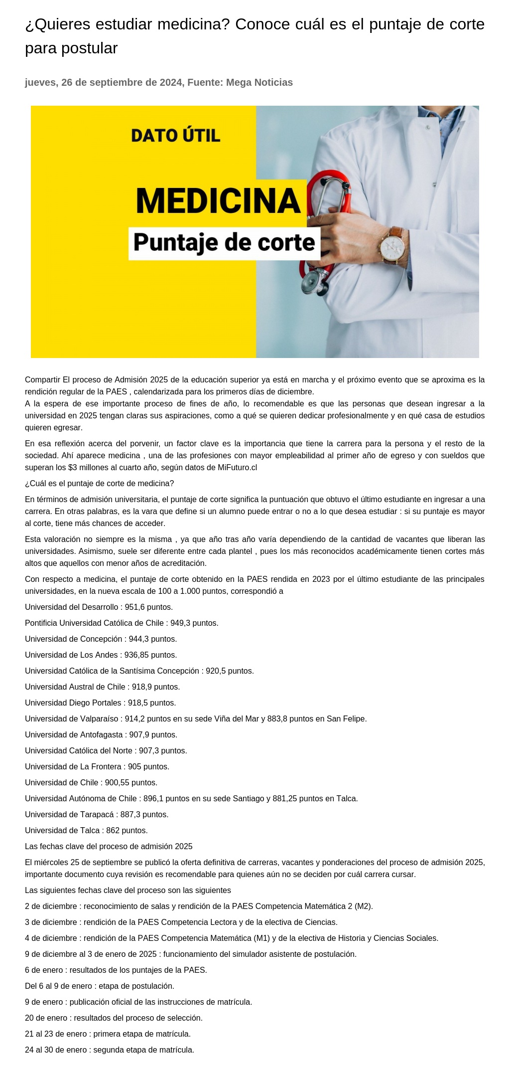 ¿Quieres estudiar medicina? Conoce cuál es el puntaje de corte para postular 26-09-2024 Mega Noticias Compartir El proceso de Admisión 2025 de la educación superior ya está en marcha y el próximo evento que se aproxima es la rendición regular de la PAES, calendarizada para los primeros días de diciem... |