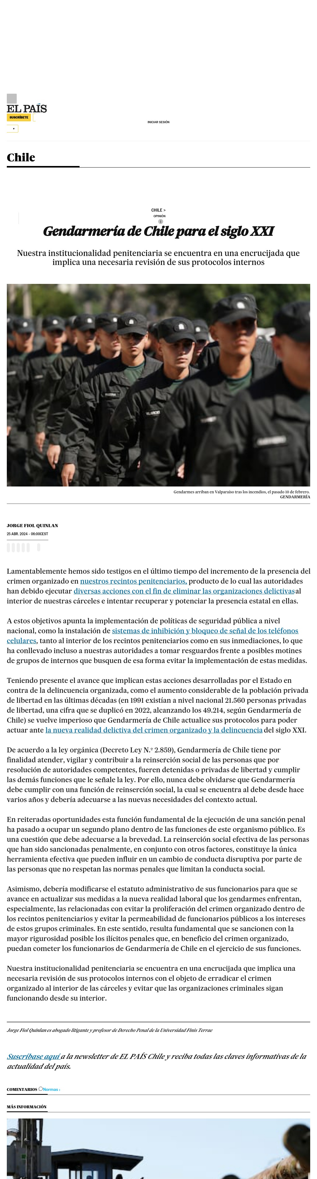 Gendarmería de Chile para el siglo XXI 25-04-2024 El Pais.com Nuestra institucionalidad penitenciaria se encuentra en una encrucijada que implica una necesaria revisión de sus protocolos internos Lamentablemente hemos sido testigos en el último tiempo del incre... |