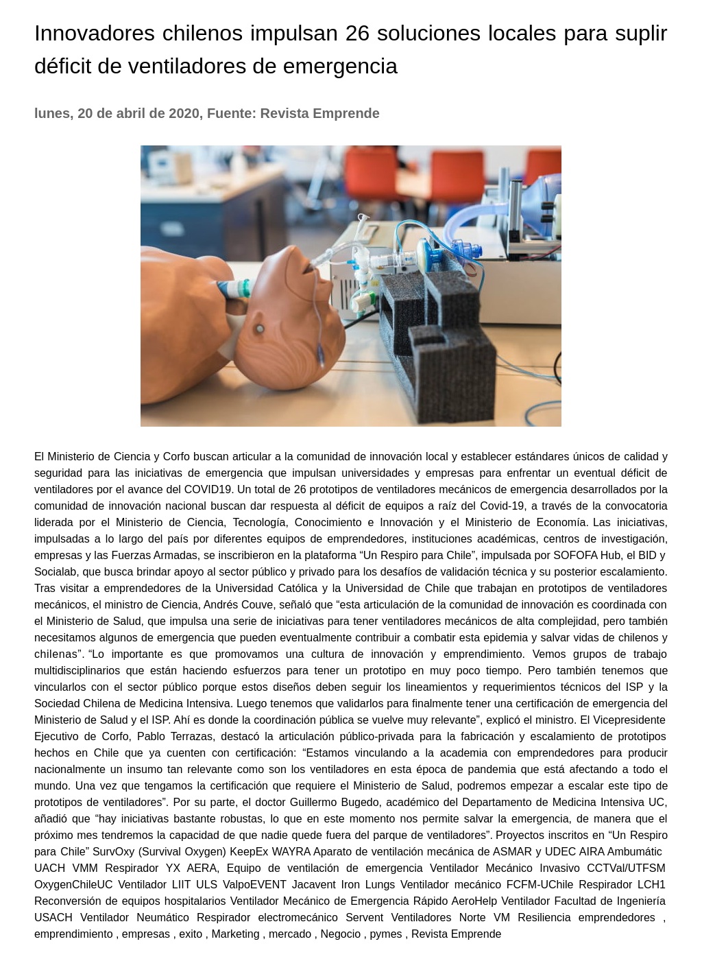 Innovadores chilenos impulsan 26 soluciones locales para suplir déficit de ventiladores de emergencia 20-04-2020 Revista Emprende El Ministerio de Ciencia y Corfo buscan articular a la comunidad de innovación local y establecer estándares únicos de calidad y seguridad para las iniciativas de emergencia que impulsan universidade... |