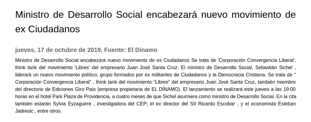 Ministro de Desarrollo Social encabezará nuevo movimiento de ex Ciudadanos Se trata de "Corporación Convergencia Liberal", think tank del movimiento "Libres" del empresario Juan José Santa Cruz. E...