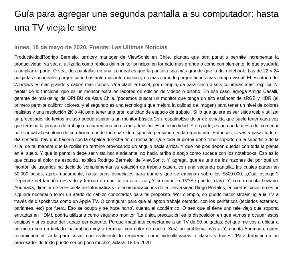 Guía para agregar una segunda pantalla a su computador: hasta una TV vieja le sirve 18-05-2020 Las Ultimas Noticias ProductividadRodrigo Bermejo, territory manager de ViewSonic en Chile, plantea que otra pantalla permite incrementar la productividad, ya sea al utilizarla como réplica del monitor principal en fo... |