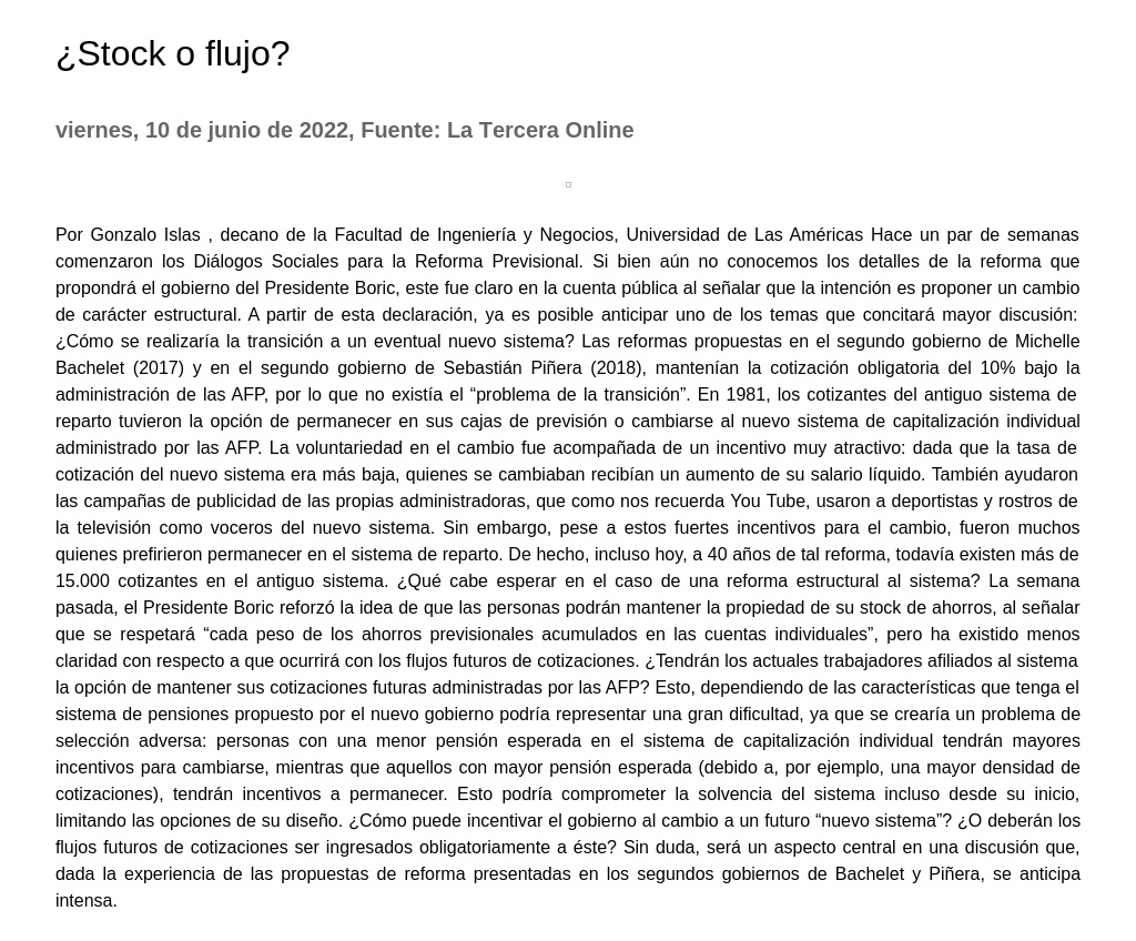 ¿Stock o flujo? 10-06-2022 La Tercera Online Por Gonzalo Islas, decano de la Facultad de Ingeniería y Negocios, Universidad de Las Américas Hace un par de semanas comenzaron los Diálogos Sociales para la Reforma Previsional. Si bien aún no ... |
