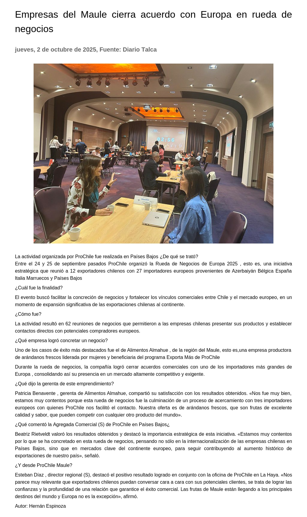 Empresas del Maule cierra acuerdo con Europa en rueda de negocios 02-10-2025 Diario Talca La actividad organizada por ProChile fue realizada en Países Bajos ¿ De qué se trató? Entre el 24 y 25 de septiembre pasados ProChile organizó la Rueda de Negocios de Europa 2025, esto es, una i... |