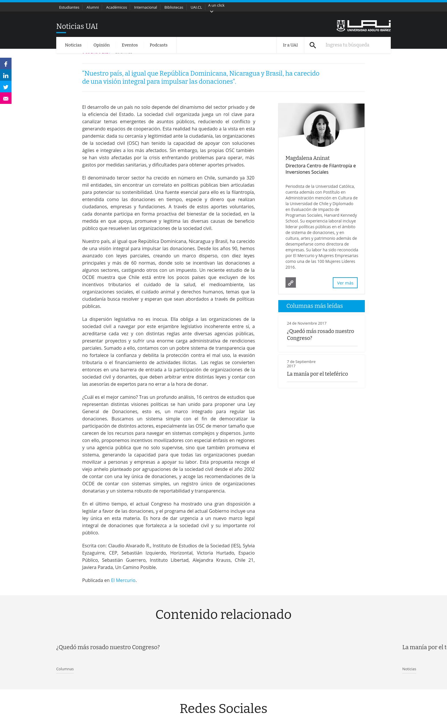 Ley general de donaciones: una urgencia impostergable 06-01-2021 Universidad Adolfo Ibañez Ley general de donaciones: una urgencia impostergable 6 de Enero 2021 Columnas “Nuestro país, al igual que República Dominicana, Nicaragua y Brasil, ha carecido de una visión integral para impulsa... |