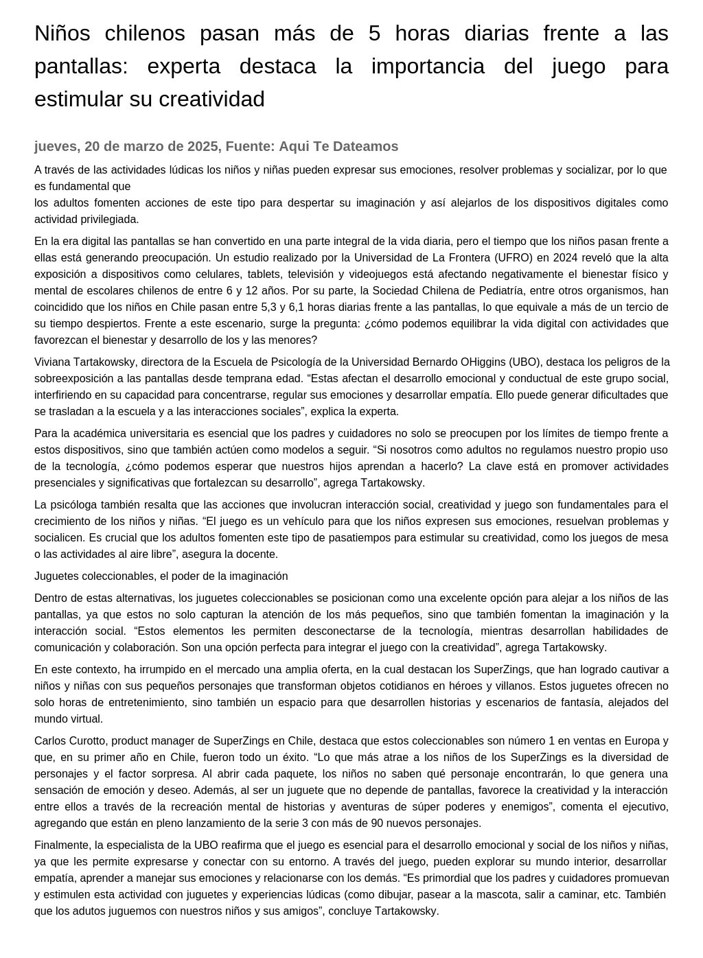 Niños chilenos pasan más de 5 horas diarias frente a las pantallas: experta destaca la importancia del juego para estimular su creatividad 20-03-2025 Aqui Te Dateamos A través de las actividades lúdicas los niños y niñas pueden expresar sus emociones, resolver problemas y socializar, por lo que es fundamental que los adultos fomenten acciones de este tipo par... |