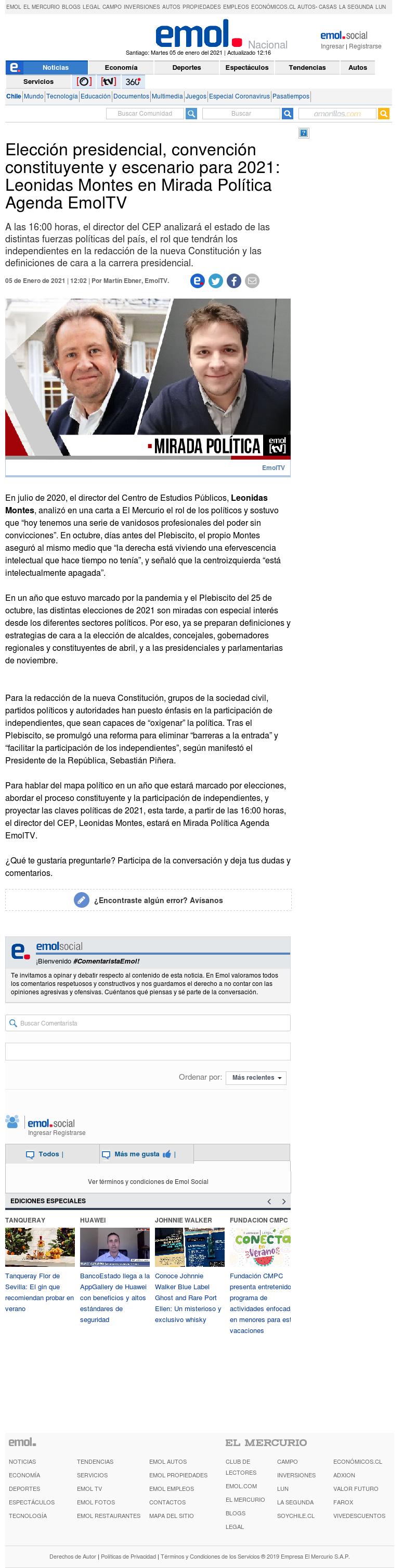 Elección presidencial, convención constituyente y escenario para 2021: Leonidas Montes en Mirada Política Agenda EmolTV 05-01-2021 EMOL Elección presidencial, convención constituyente y escenario para 2021: Leonidas Montes en Mirada Política Agenda EmolTV A las 16:00 horas, el director del CEP analizará el estado de las distintas f... |
