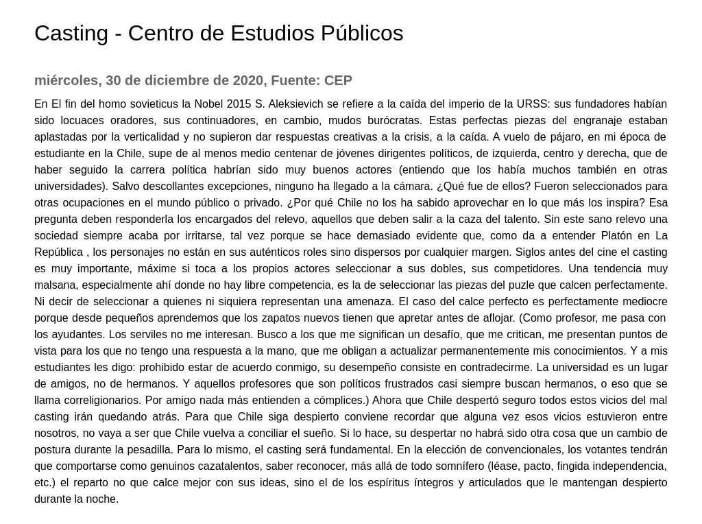 Casting - Centro de Estudios Públicos 30-12-2020 CEP En El fin del homo sovieticus la Nobel 2015 S. Aleksievich se refiere a la caída del imperio de la URSS: sus fundadores habían sido locuaces oradores, sus continuadores, en cambio, mudos burócra... |