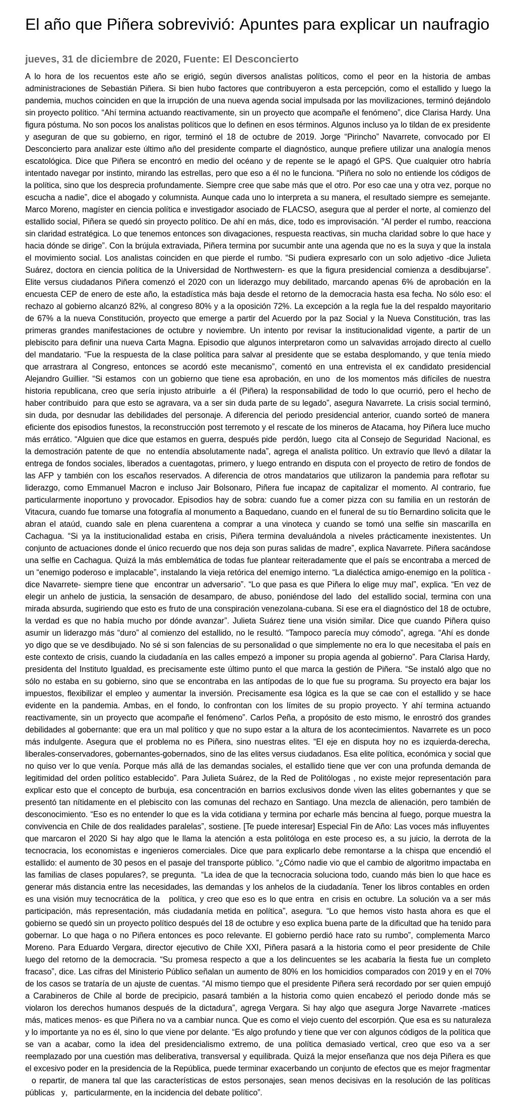 El año que Piñera sobrevivió: Apuntes para explicar un naufragio 31-12-2020 El Desconcierto A lo hora de los recuentos este año se erigió, según diversos analistas políticos, como el peor en la historia de ambas administraciones de Sebastián Piñera. Si bien hubo factores que contribuye... |