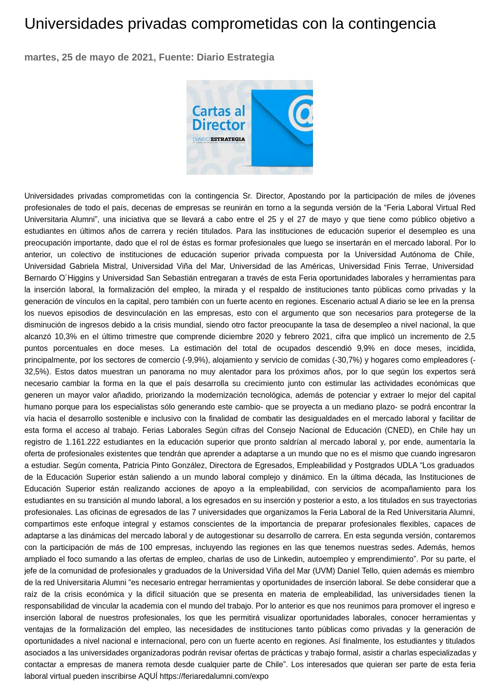 Universidades privadas comprometidas con la contingencia 25-05-2021 Diario Estrategia Universidades privadas comprometidas con la contingencia Sr. Director, Apostando por la participación de miles de jóvenes profesionales de todo el país, decenas de empresas se reunirán en torno ... |