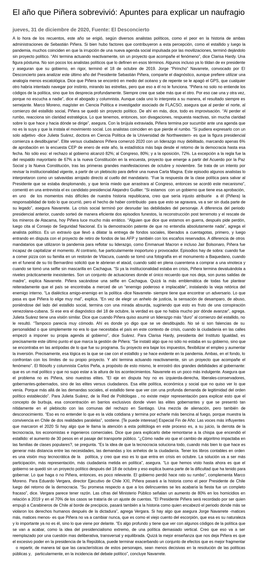 El año que Piñera sobrevivió: Apuntes para explicar un naufragio 31-12-2020 El Desconcierto A lo hora de los recuentos, este año se erigió, según diversos analistas políticos, como el peor en la historia de ambas administraciones de Sebastián Piñera. Si bien hubo factores que contribu... |