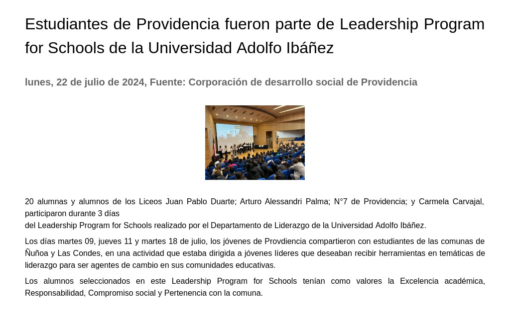 Estudiantes de Providencia fueron parte de Leadership Program for Schools de la Universidad Adolfo Ibáñez 22-07-2024 Corporación de desarrollo social de Providencia 20 alumnas y alumnos de los Liceos Juan Pablo Duarte; Arturo Alessandri Palma; N°7 de Providencia; y Carmela Carvajal, participaron durante 3 días del Leadership Program for Schools realizado por... |