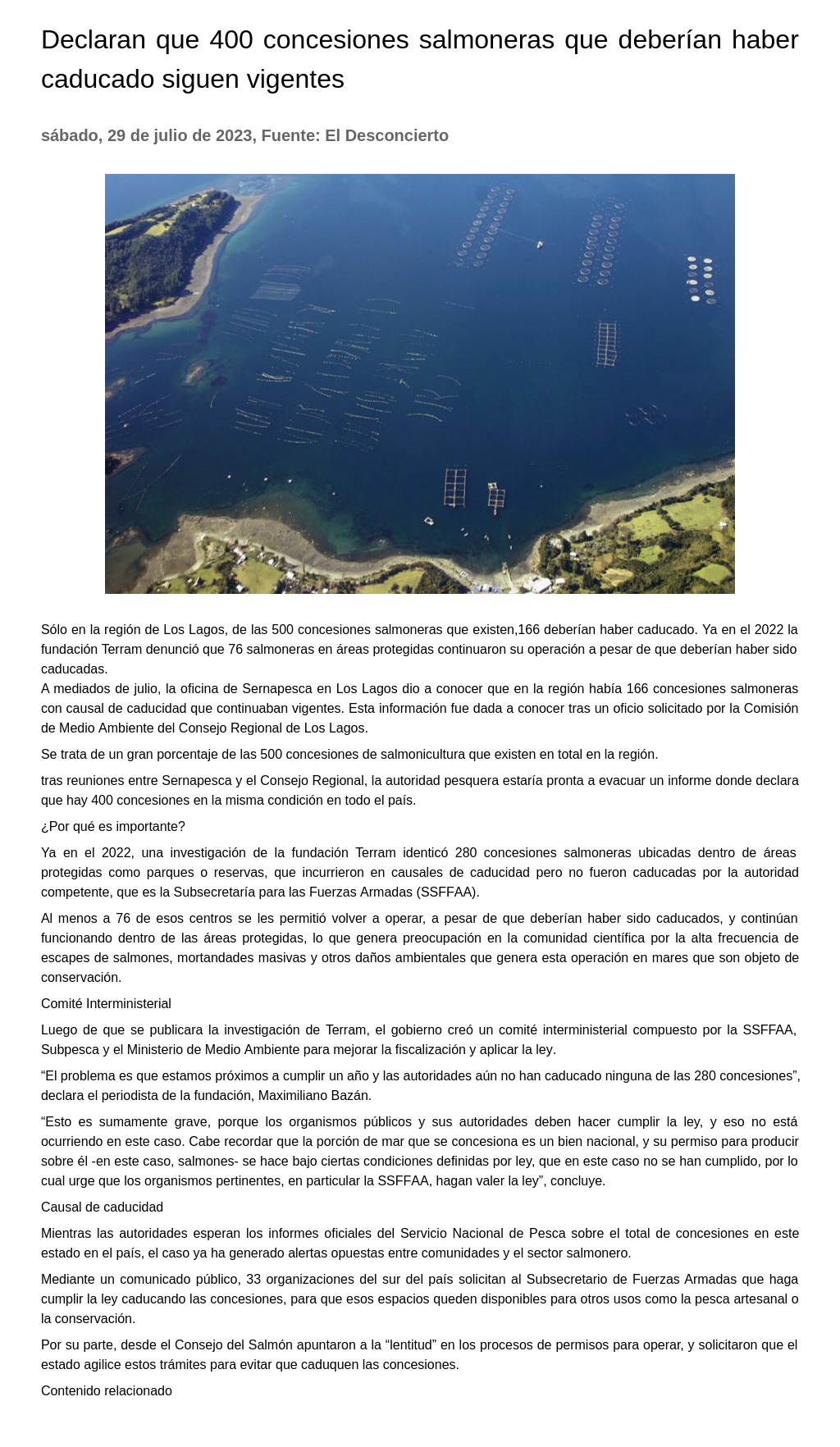 Declaran que 400 concesiones salmoneras que deberían haber caducado siguen vigentes 29-07-2023 El Desconcierto Sólo en la región de Los Lagos, de las 500 concesiones salmoneras que existen, 166 deberían haber caducado. Ya en el 2022 la fundación Terram denunció que 76 salmoneras en áreas protegidas contin... |