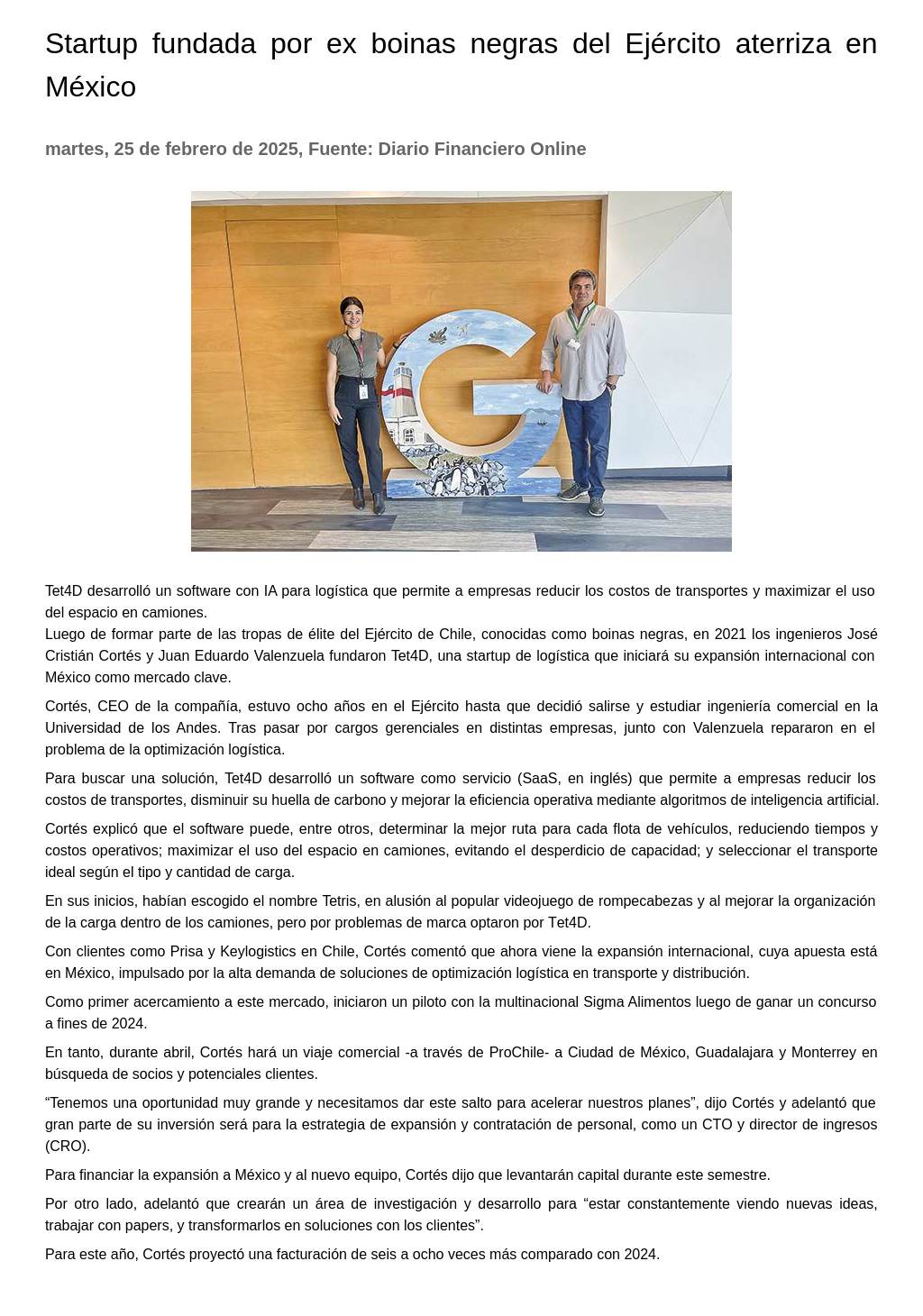 Startup fundada por ex boinas negras del Ejército aterriza en México 25-02-2025 Diario Financiero Online Tet4D desarrolló un software con IA para logística que permite a empresas reducir los costos de transportes y maximizar el uso del espacio en camiones. Luego de formar parte de las tropas de éli... |