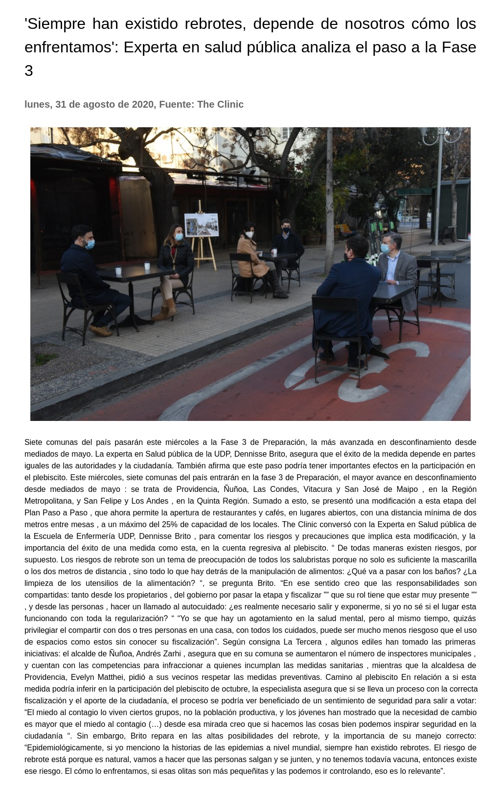 "Siempre han existido rebrotes, depende de nosotros cómo los enfrentamos": Experta en salud pública analiza el paso a la Fase 3 31-08-2020 The Clinic Siete comunas del país pasarán este miércoles a la Fase 3 de Preparación, la más avanzada en desconfinamiento desde mediados de mayo. La experta en Salud pública de la UDP, Dennisse Brito, asegu... |