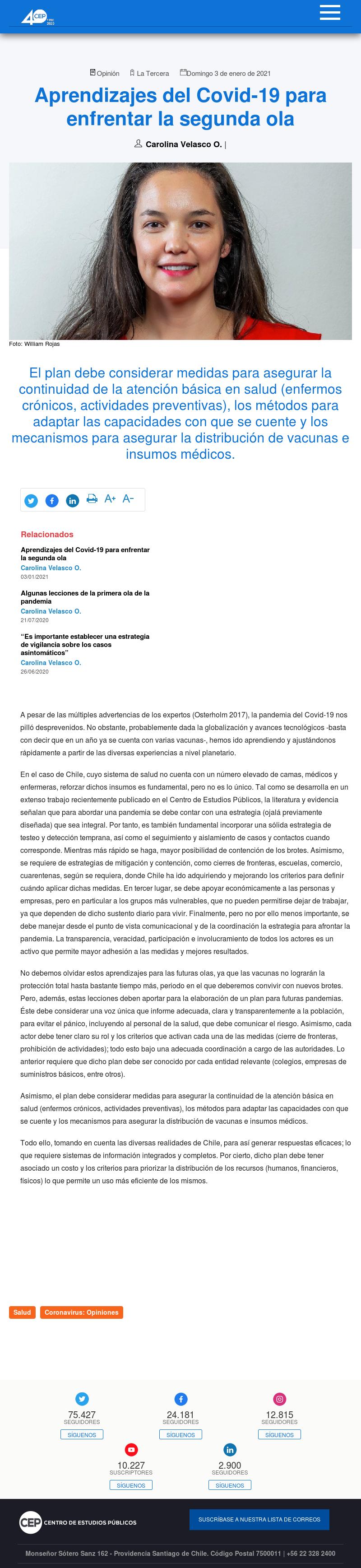 Aprendizajes del Covid-19 para enfrentar la segunda ola - Centro de Estudios Públicos 04-01-2021 CEP A pesar de las múltiples advertencias de los expertos (Osterholm 2017), la pandemia del Covid-19 nos pilló desprevenidos. No obstante, probablemente dada la globalización y avances tecnológicos ... |