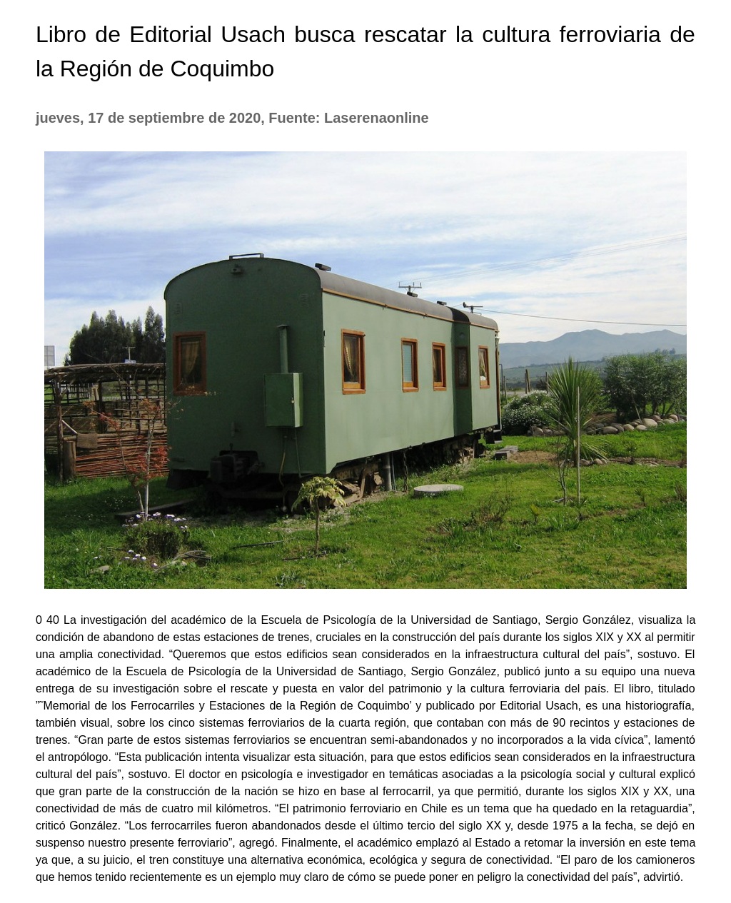 Libro de Editorial Usach busca rescatar la cultura ferroviaria de la Región de Coquimbo 17-09-2020 Laserenaonline 0 40 La investigación del académico de la Escuela de Psicología de la Universidad de Santiago, Sergio González, visualiza la condición de abandono de estas estaciones de trenes, cruciales en la co... |