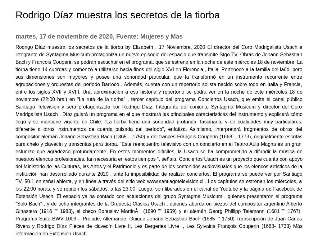 Rodrigo Díaz muestra los secretos de la tiorba 17-11-2020 Mujeres y Mas Rodrigo Díaz muestra los secretos de la tiorba by Elizabeth, 17 Noviembre, 2020 El director del Coro Madrigalista Usach e integrante de Syntagma Musicum protagoniza un nuevo episodio del espacio que... |