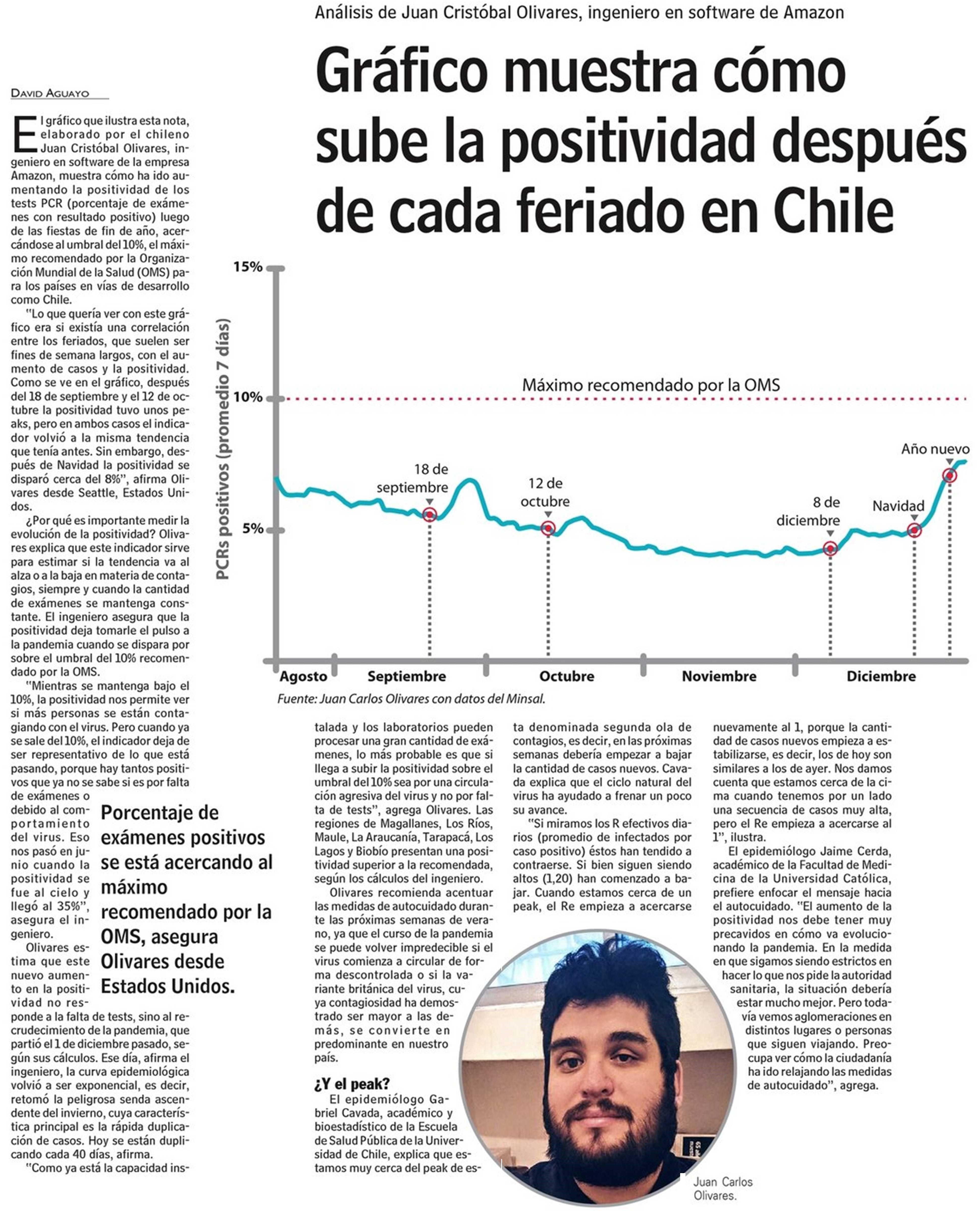 Gráfico muestra cómo sube la positividad después de cada feriado en Chile