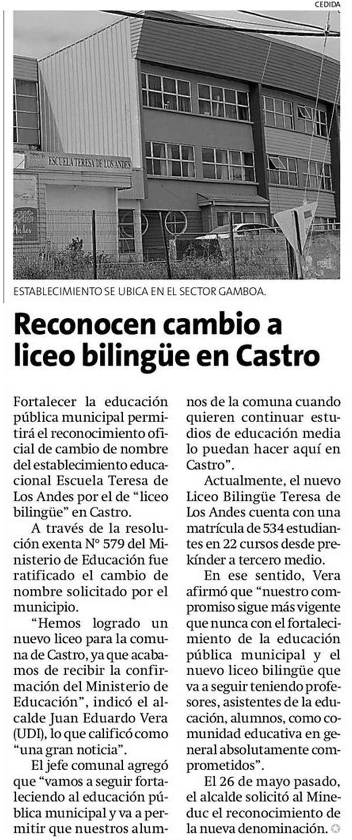 Reconocen cambio a liceo bilingüe en Castro