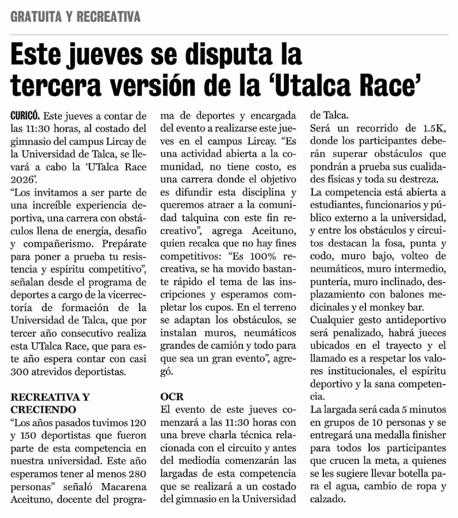 Este jueves se disputa la tercera versión de la 'Utalca Race'
