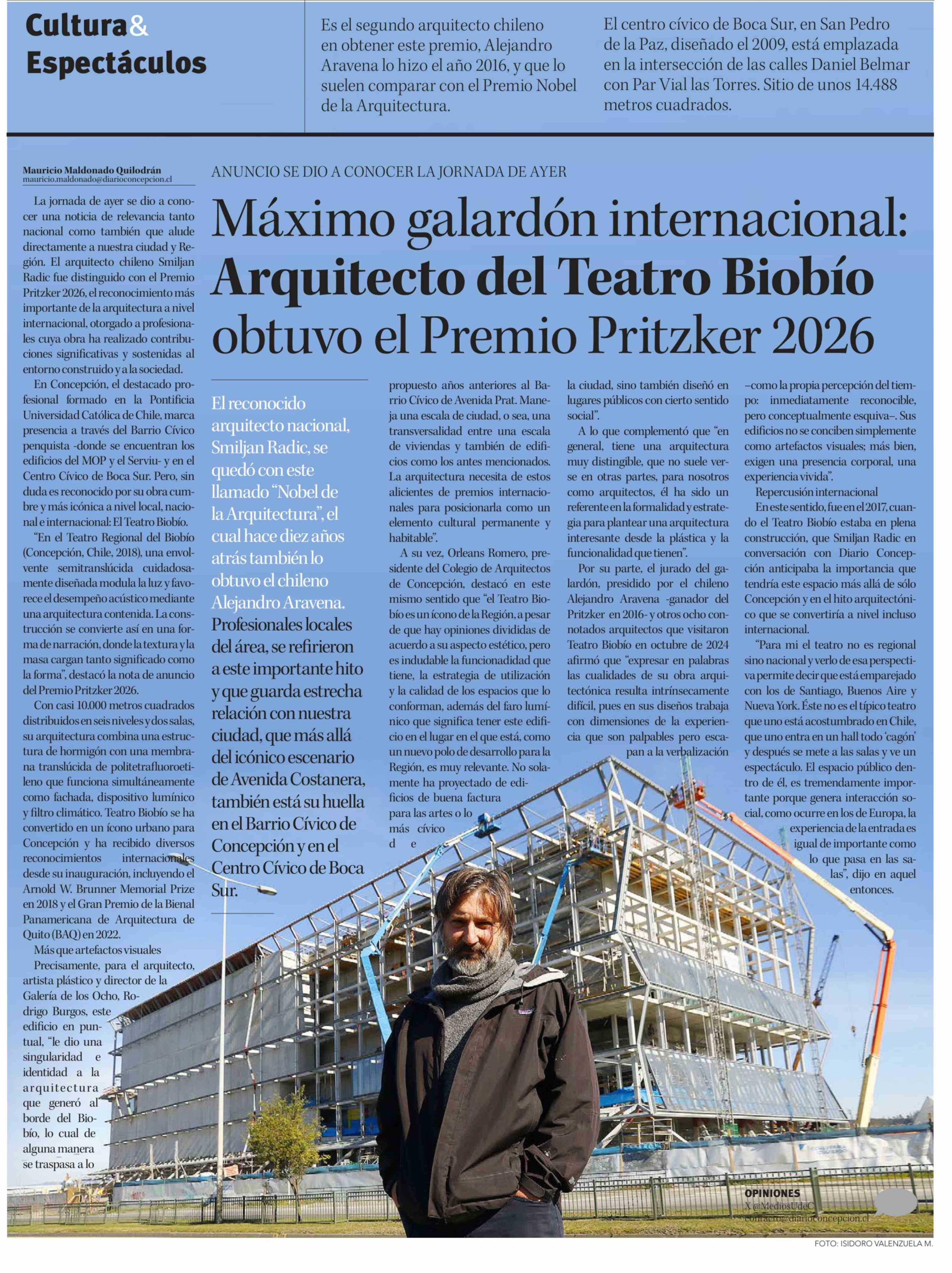 Título: Máximo galardón internacional: Arquitecto del Teatro Biobío obtuvo el Premio Pritzker 2026