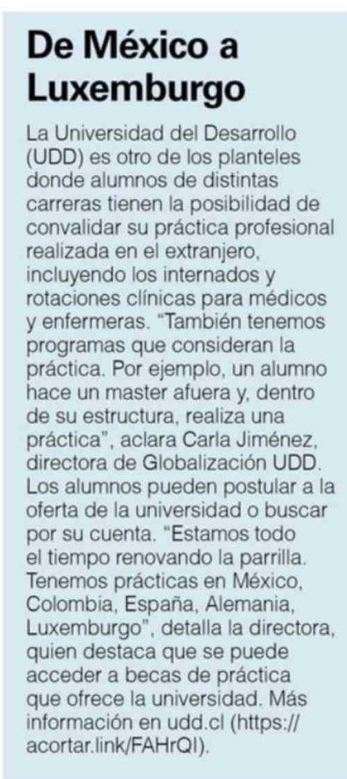 | Título: | De México a Luxemburgo La Universidad del Desarrollo (UDD) es otro de los planteles donde alumnos de distintas carreras tienen la posibilidad de convalidar su práctica profesional realizada en el extranjero, incluyendo los internados y rotaciones clínicas para médicos y enfermeras. "También tenemos |