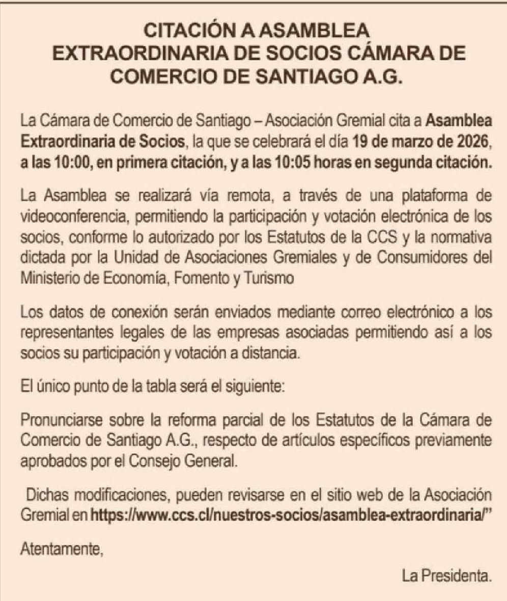CITACIÓN A ASAMBLEA EXTRAORDINARIA DE SOCIOS CÁMARA DE COMERCIO DE SANTIAGO A.G.