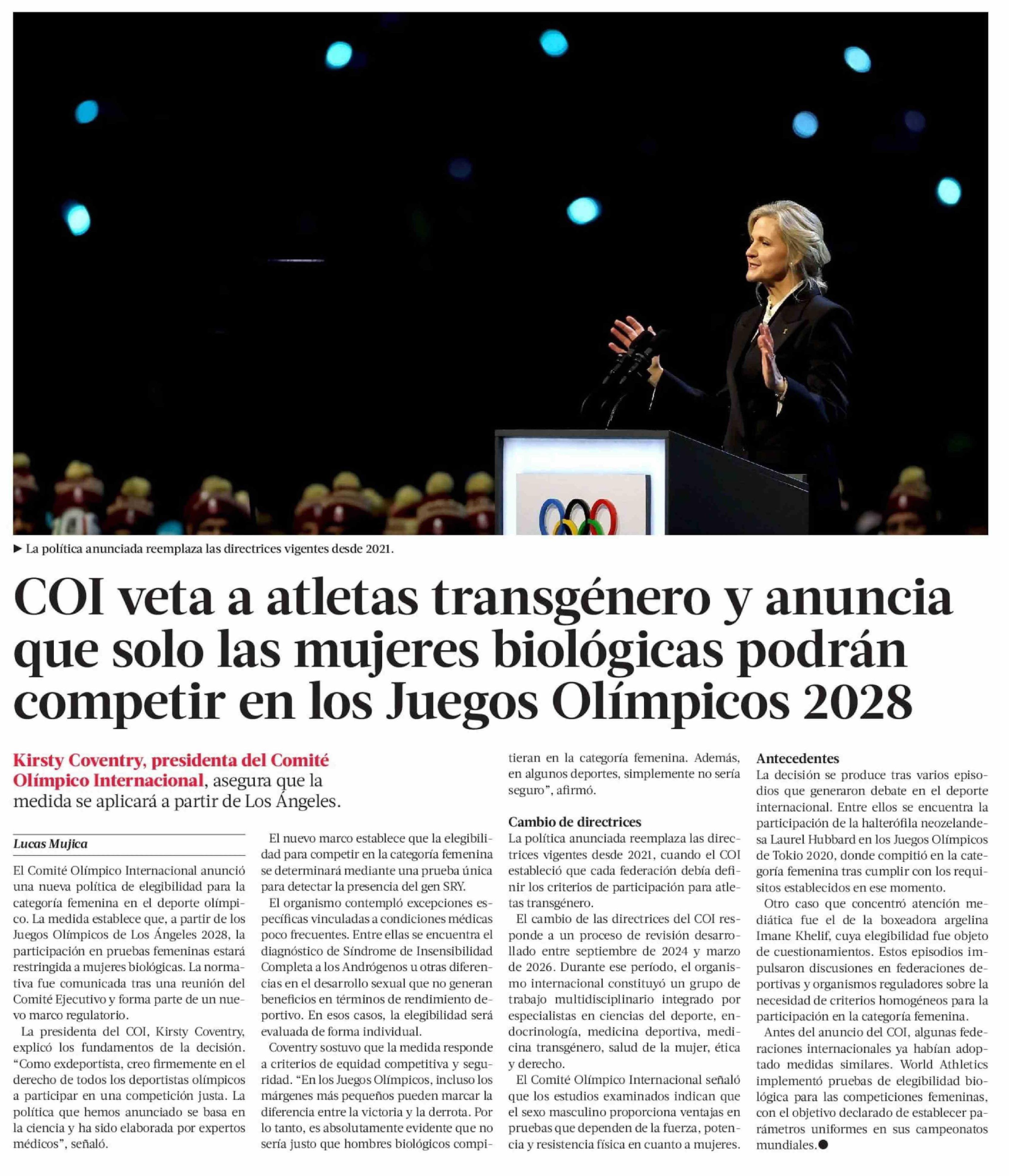 COI veta a atletas transgénero y anuncia que solo las mujeres biológicas podrán competir en los Juegos Olímpicos 2028