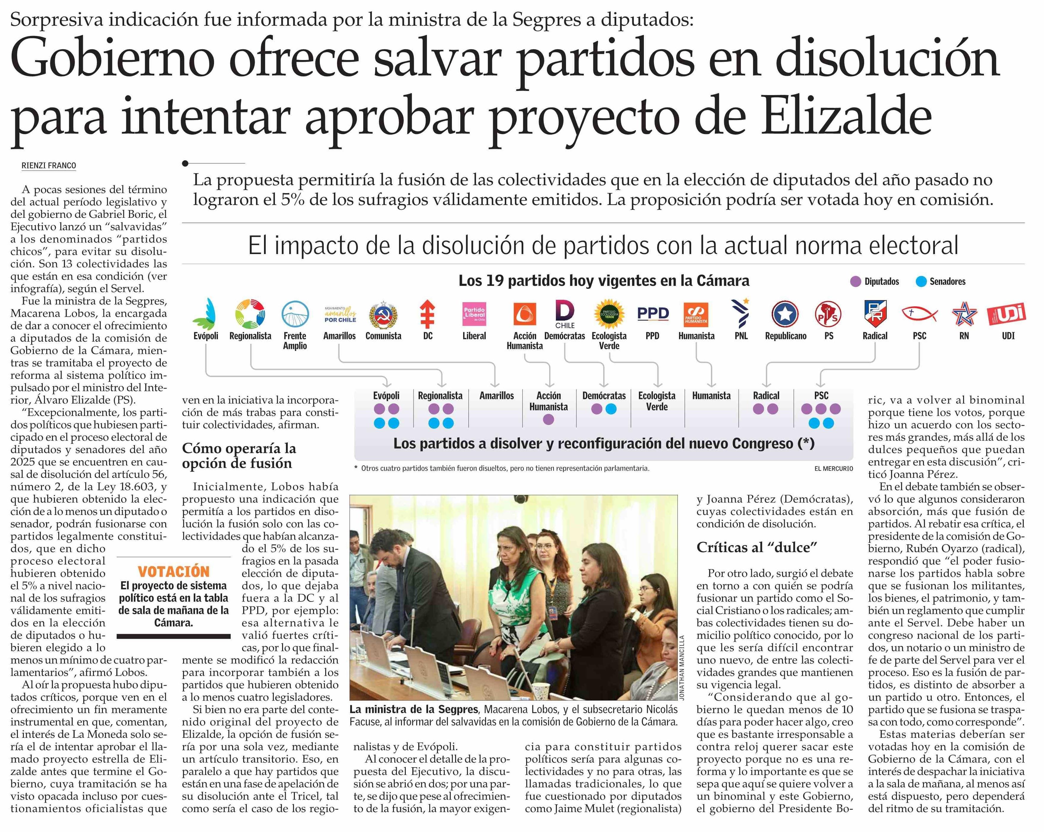 Gobierno ofrece salvar partidos en disolución para intentar aprobar proyecto de Elizalde