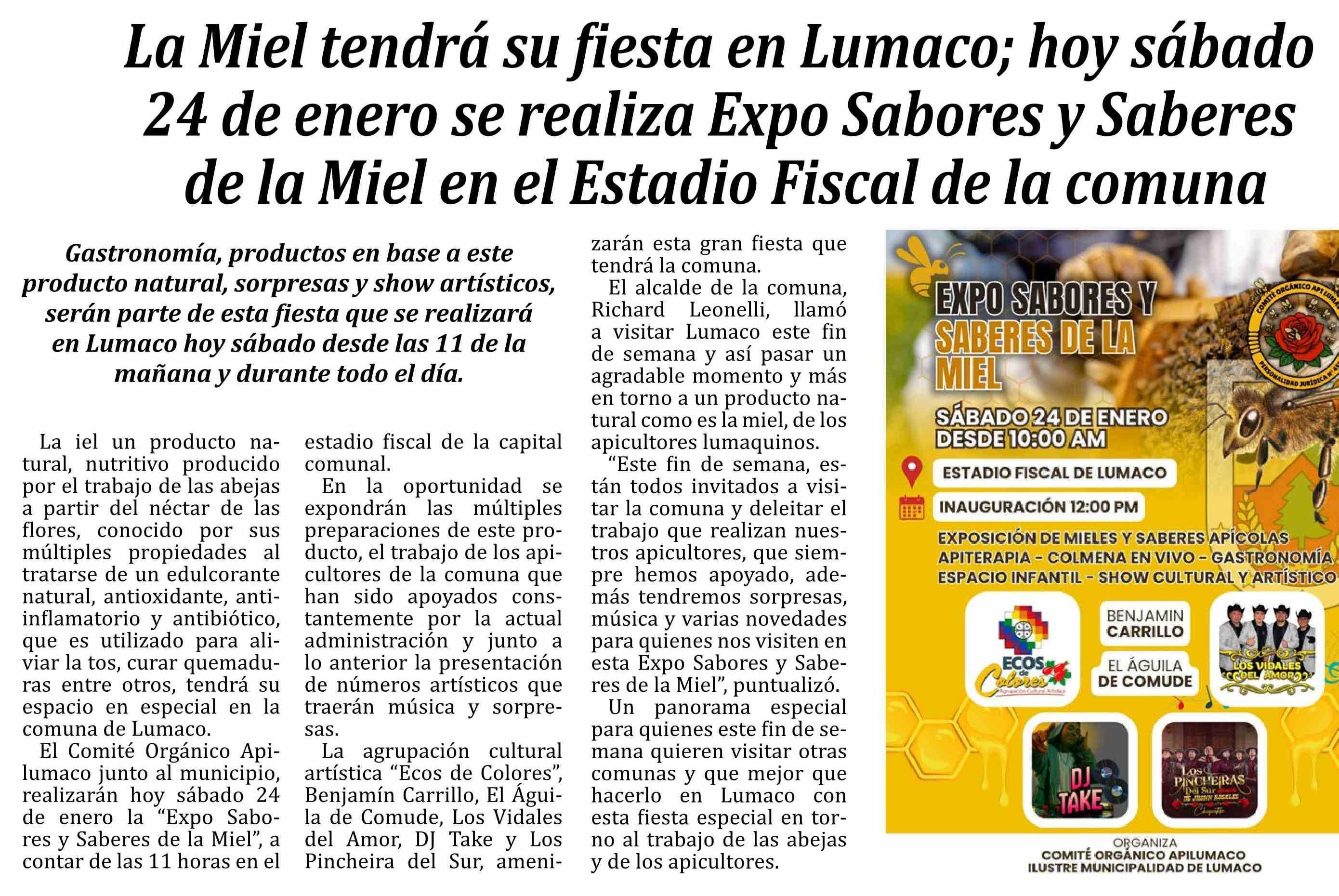 Título: La Miel tendrá su fiesta en Lumaco; hoy sábado 24 de enero se realiza Expo Sabores y Saberes de la Miel en el Estadio Fiscal de la comuna