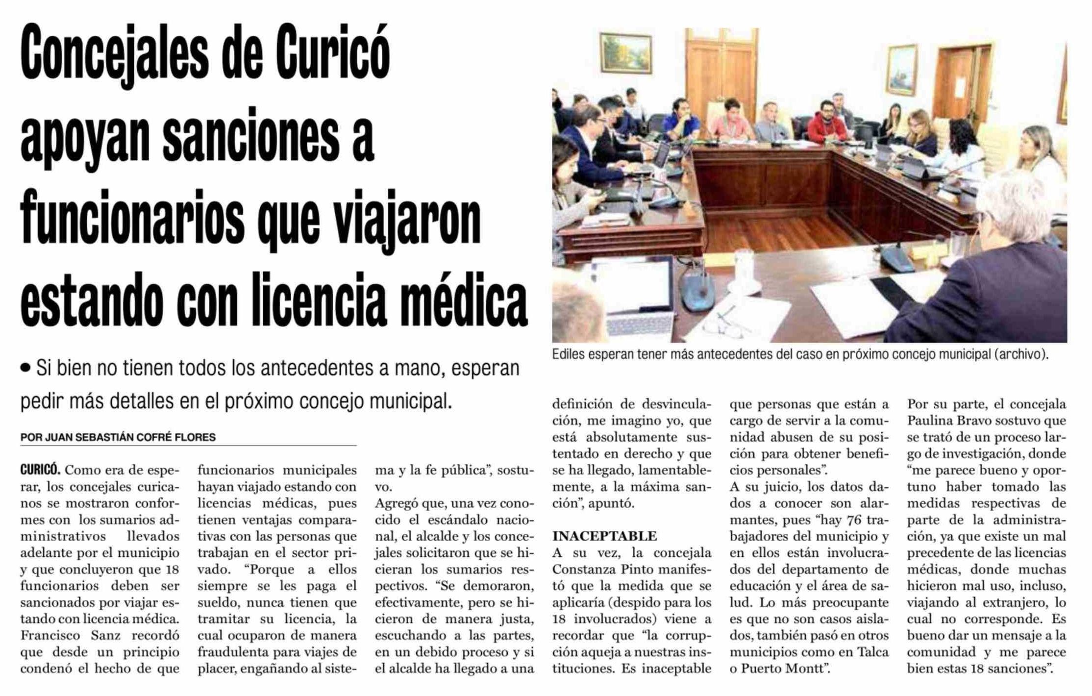 Concejales de Curicó apoyan sanciones a funcionarios que viajaron estando con licencia médica