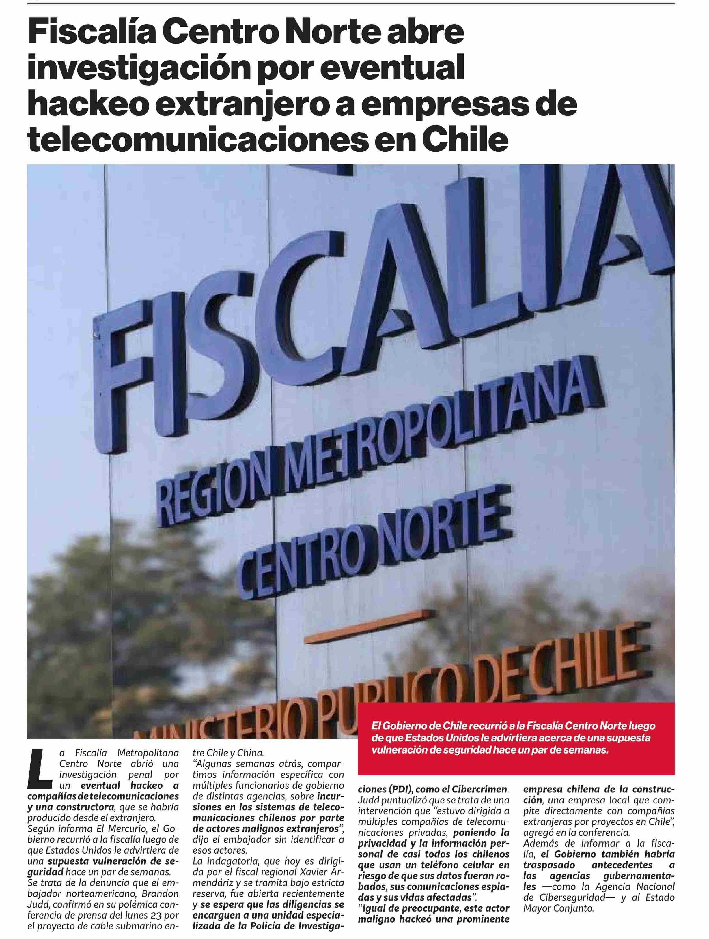 Fiscalía Centro Norte abre investigación por eventual hackeo extranjero a empresas de telecomunicaciones en Chile