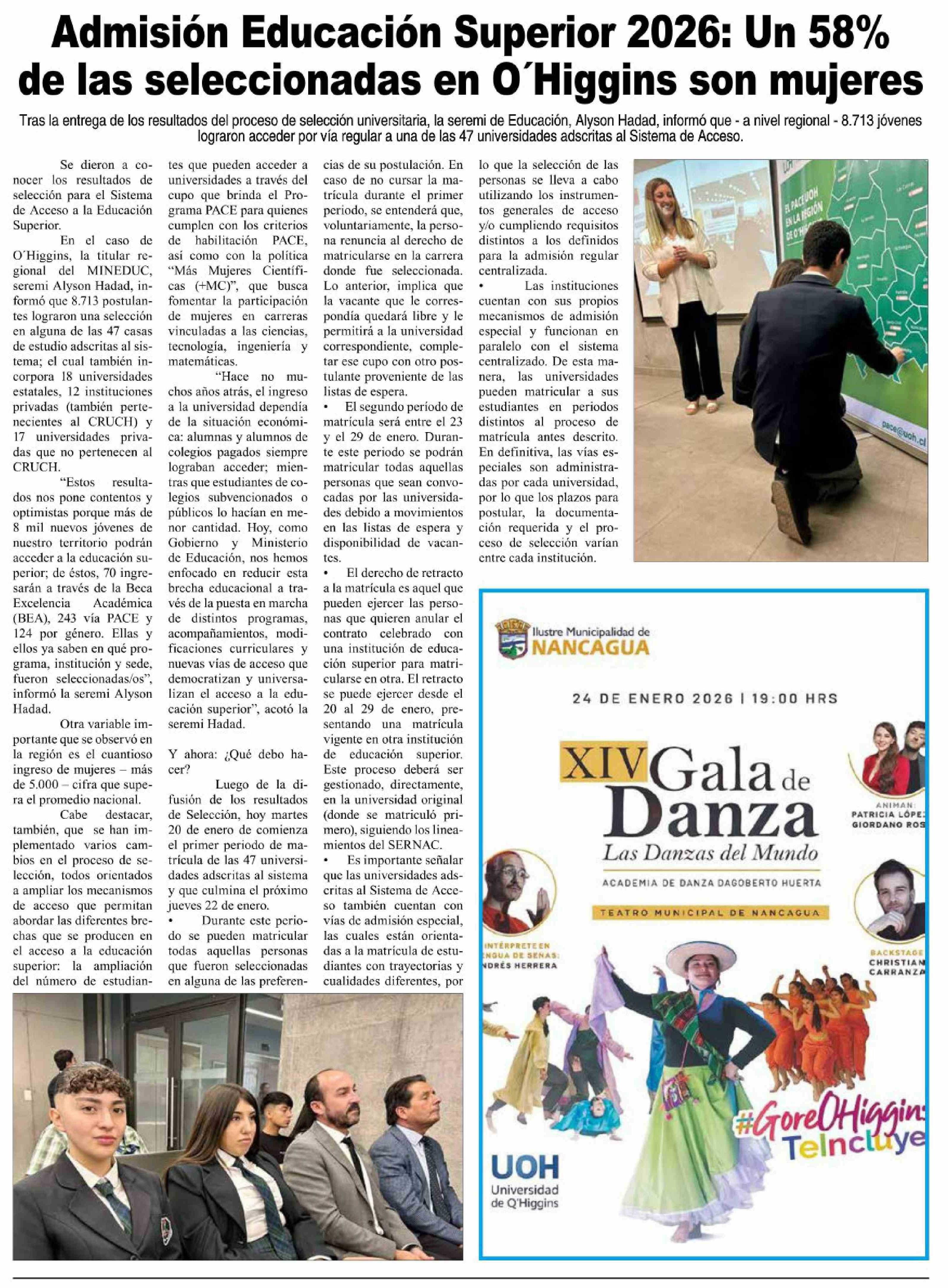 Admisión Educación Superior 2026: Un 58% de las seleccionadas en O'Higgins son mujeres