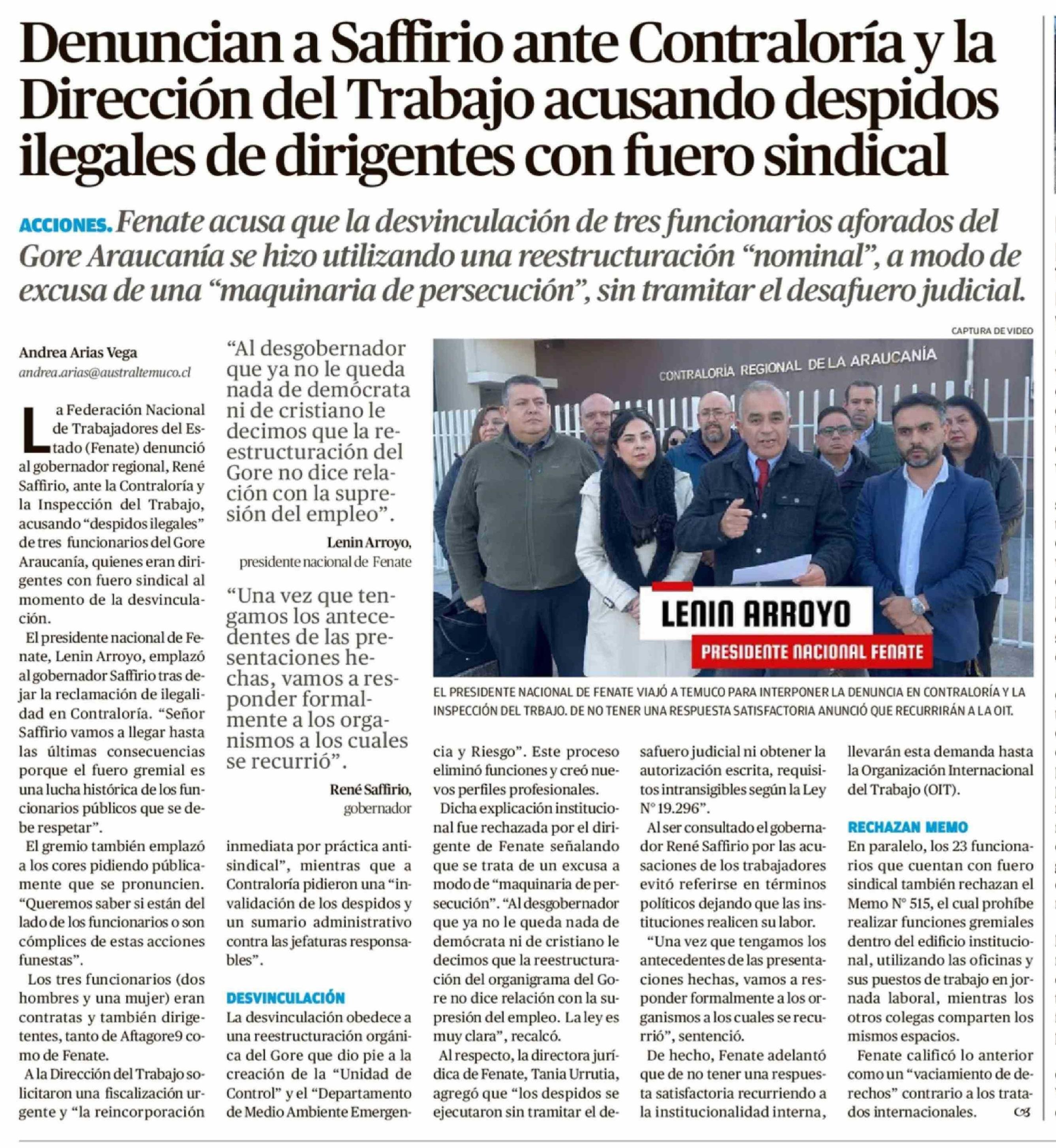 Denuncian a Saffirio ante Contraloría y la Dirección del Trabajo acusando despidos ilegales de dirigentes con fuero sindical