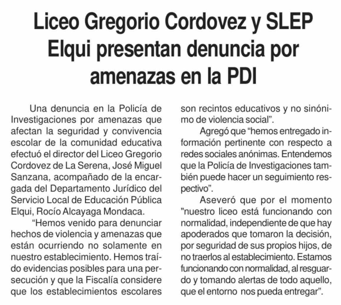 Liceo Gregorio Cordovez y SLEP Elqui presentan denuncia por amenazas en la PDI