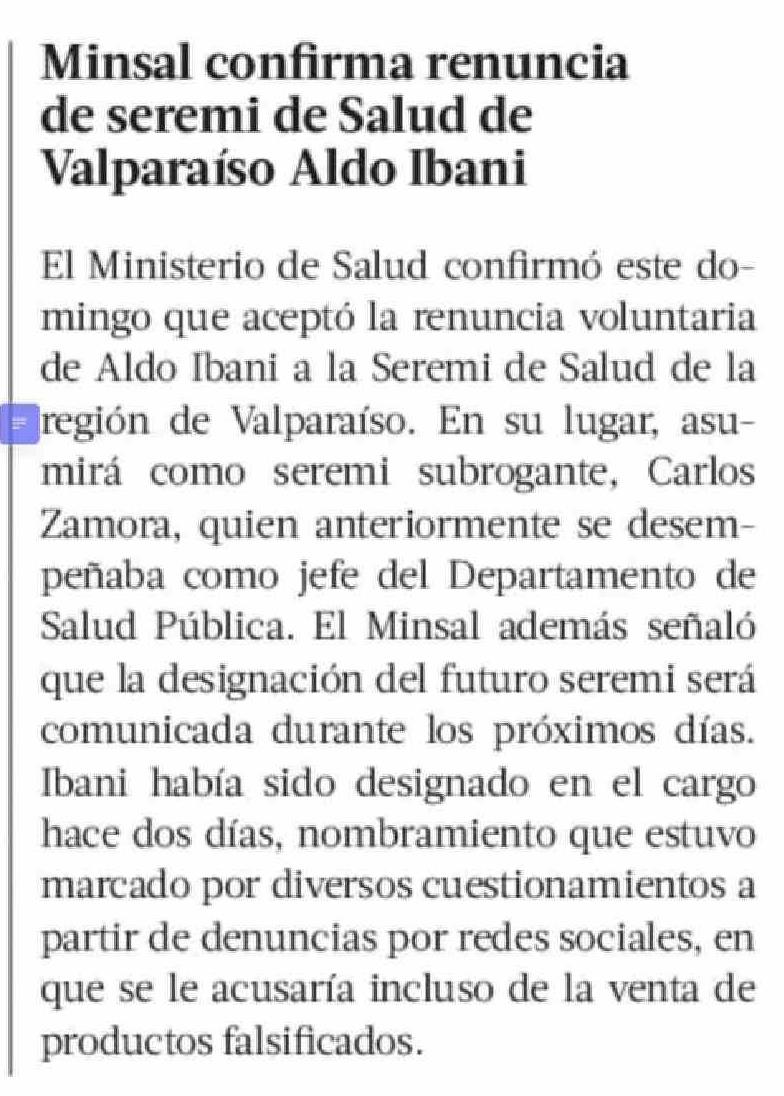 Minsal confirma renuncia de seremi de Salud de Valparaíso Aldo Ibani