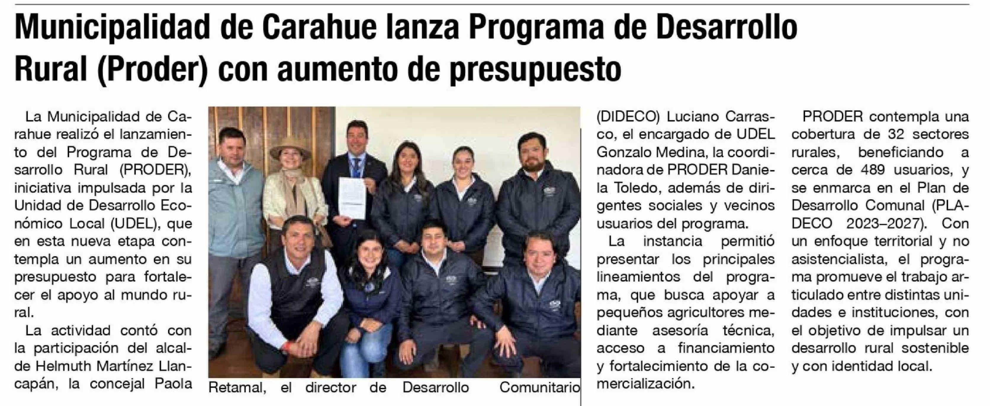 Municipalidad de Carahue lanza Programa de Desarrollo Rural (Proder) con aumento de presupuesto