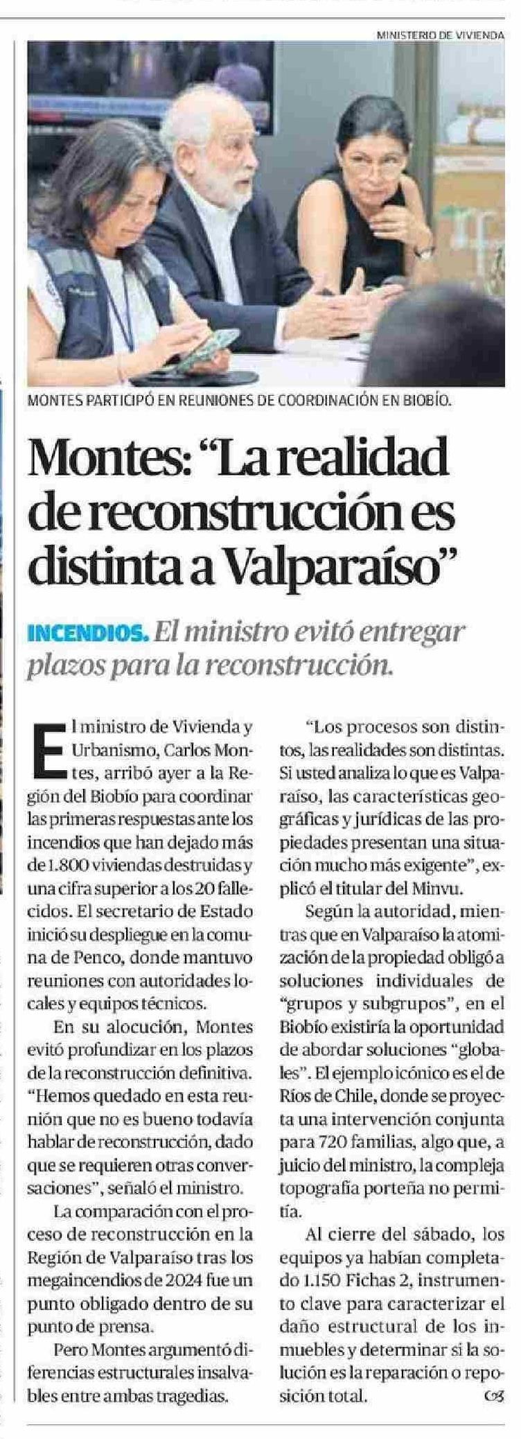 Montes: "La realidad de reconstrucción es distinta a Valparaíso"