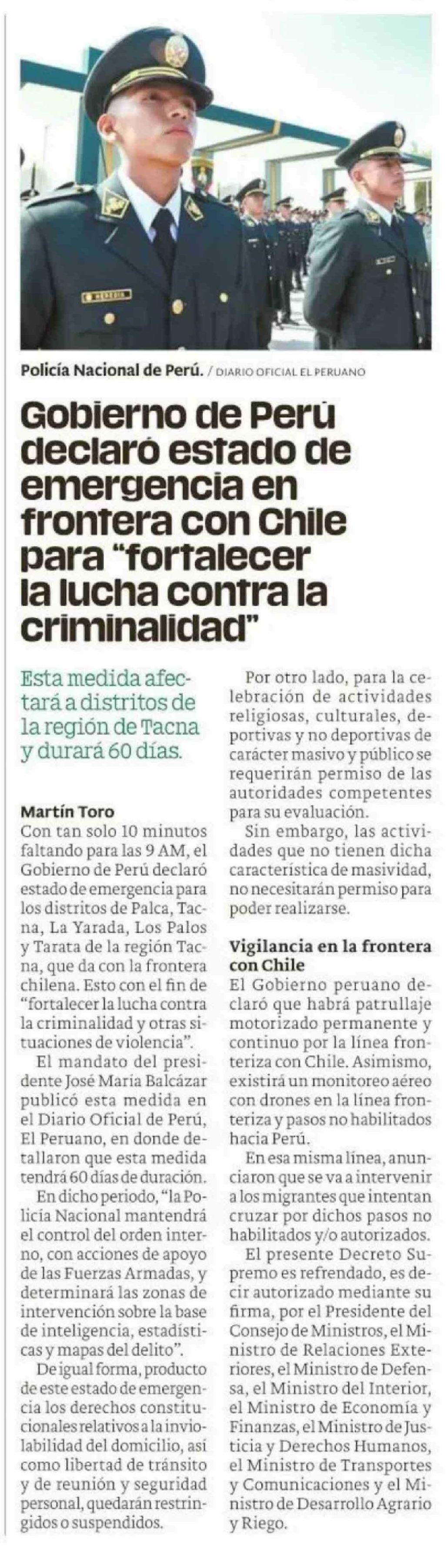 Gobierno de Peru declaro estado de emergencia en frontera con Chile para "fortalecer la lucha contra la criminalidad"