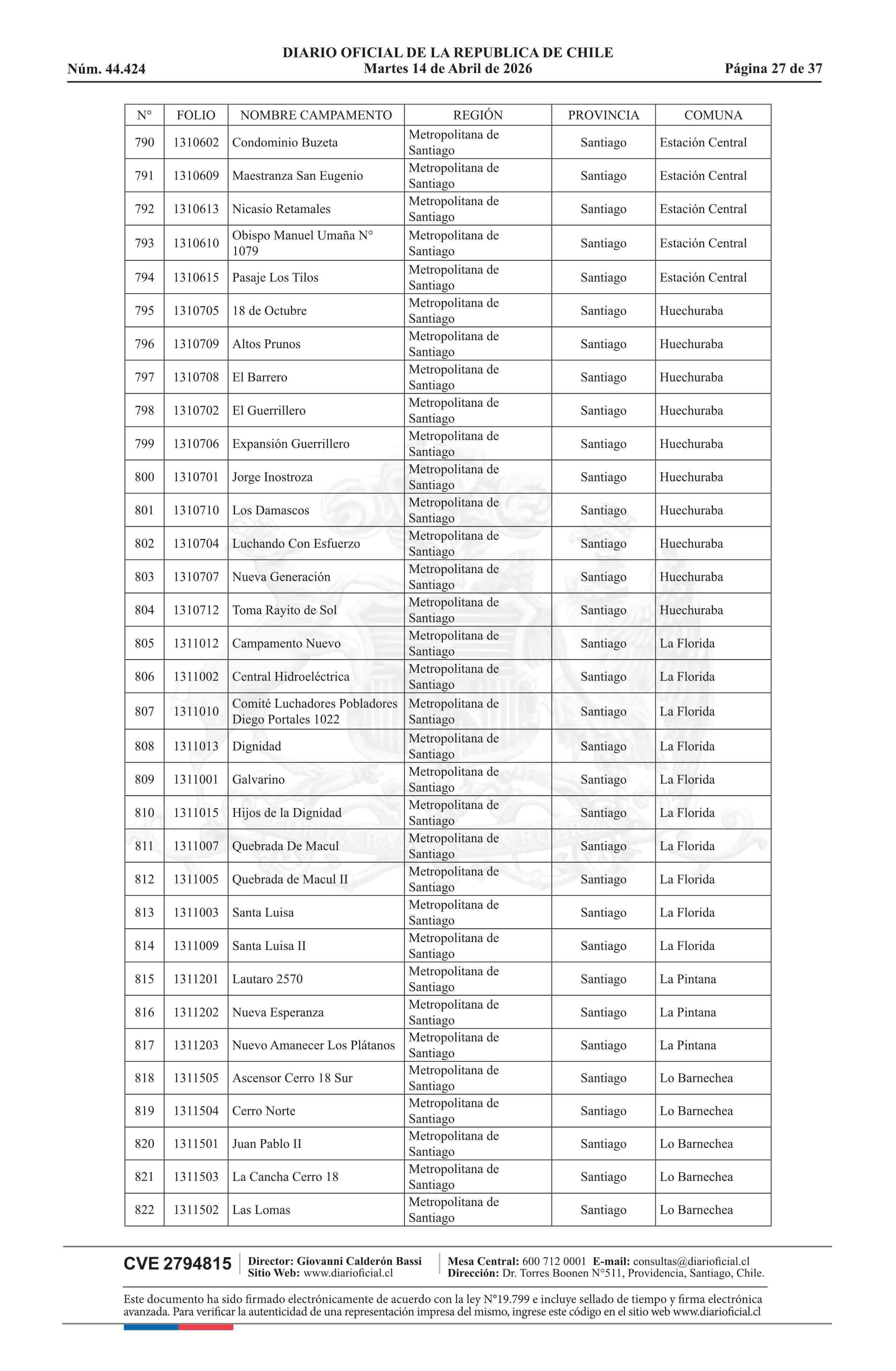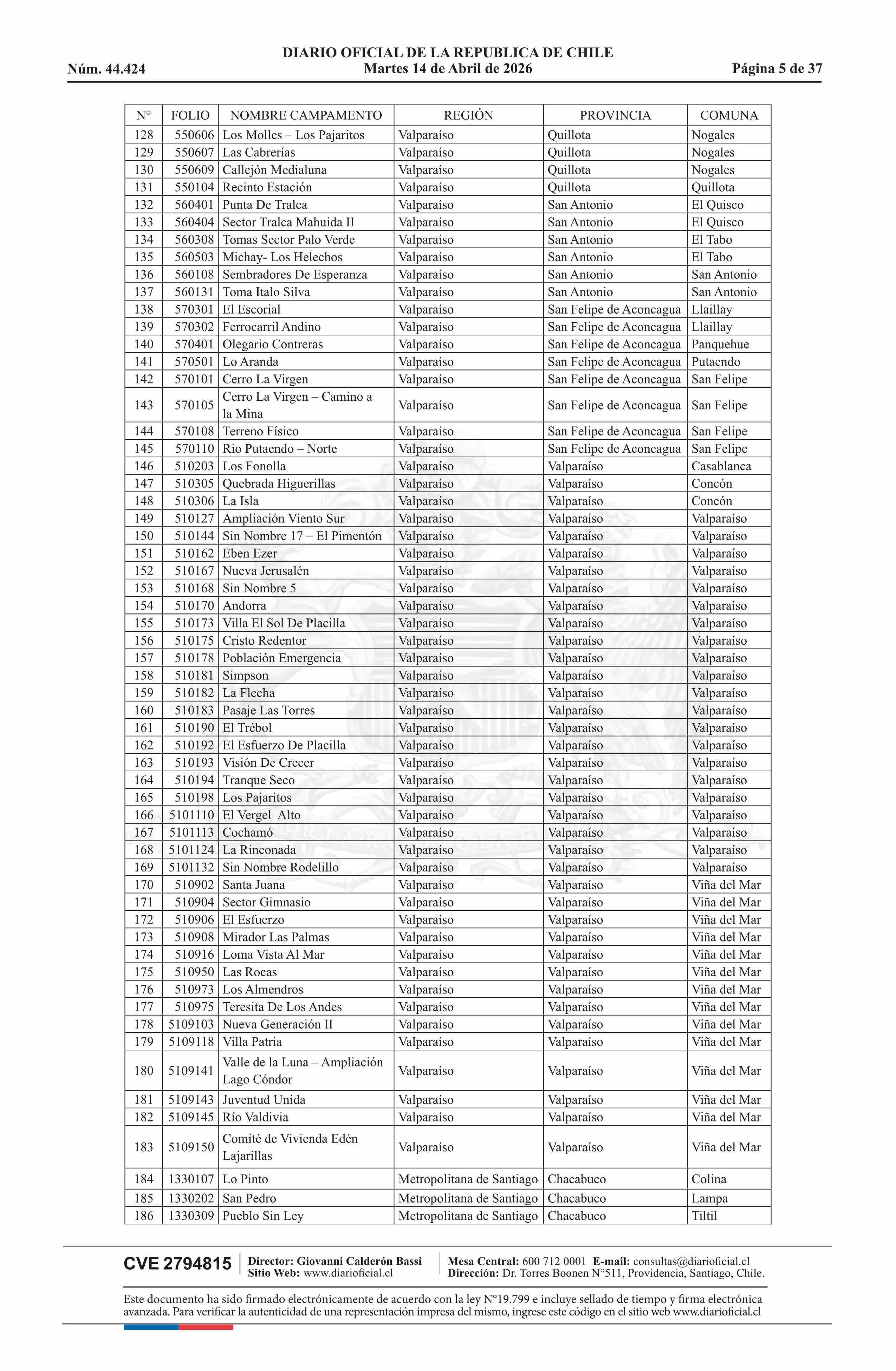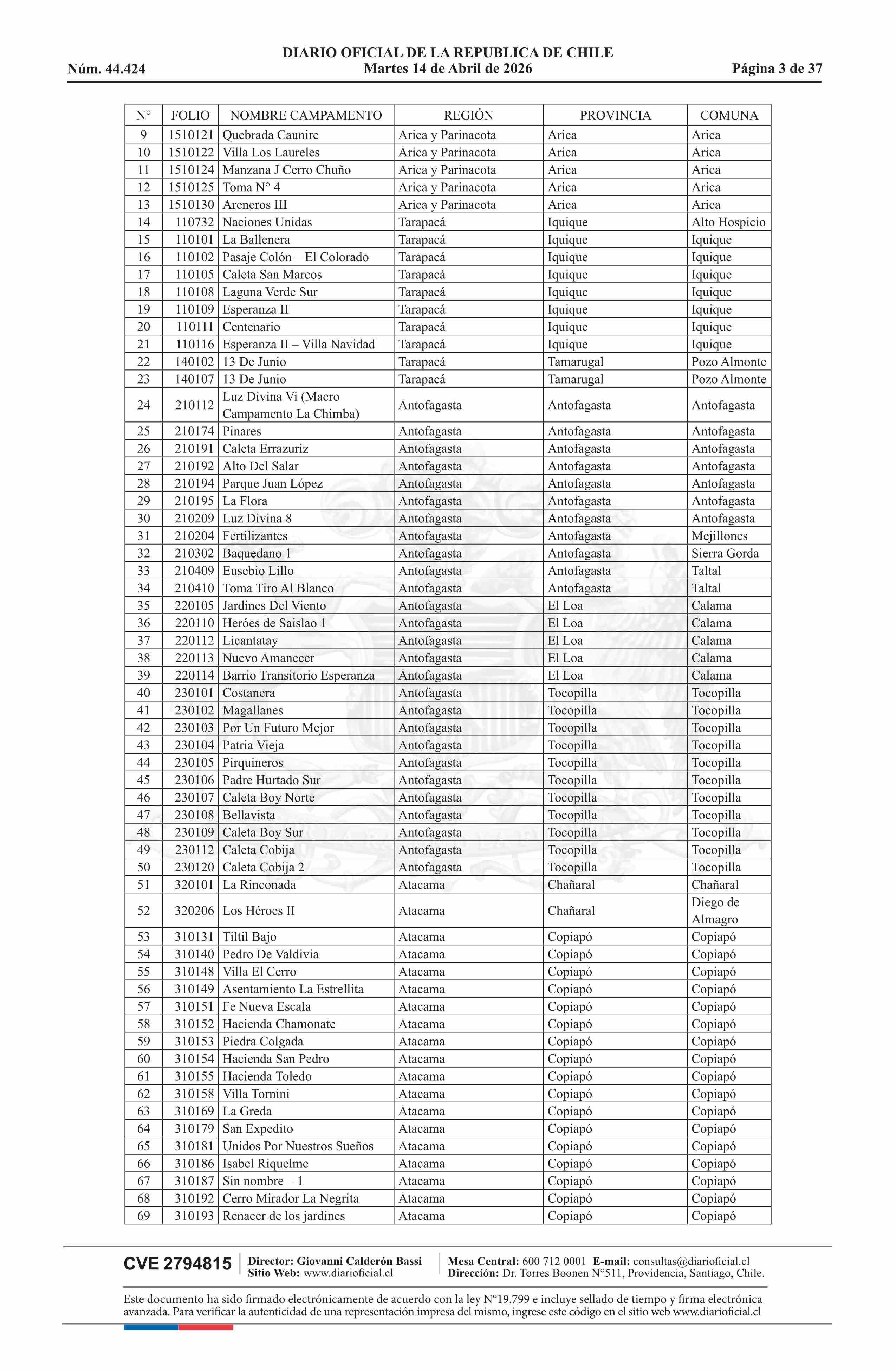 | Título: | Resolución exenta número 377, de 2026.- Aprueba actualización del Registro Histórico de Campamentos y actualización del Registro Vigente de Campamentos, del Catastro de Asentamientos Precarios al 27 de febrero de 2026, y revoca las resoluciones N°s. 335 y 713 exentas, de 2024 |