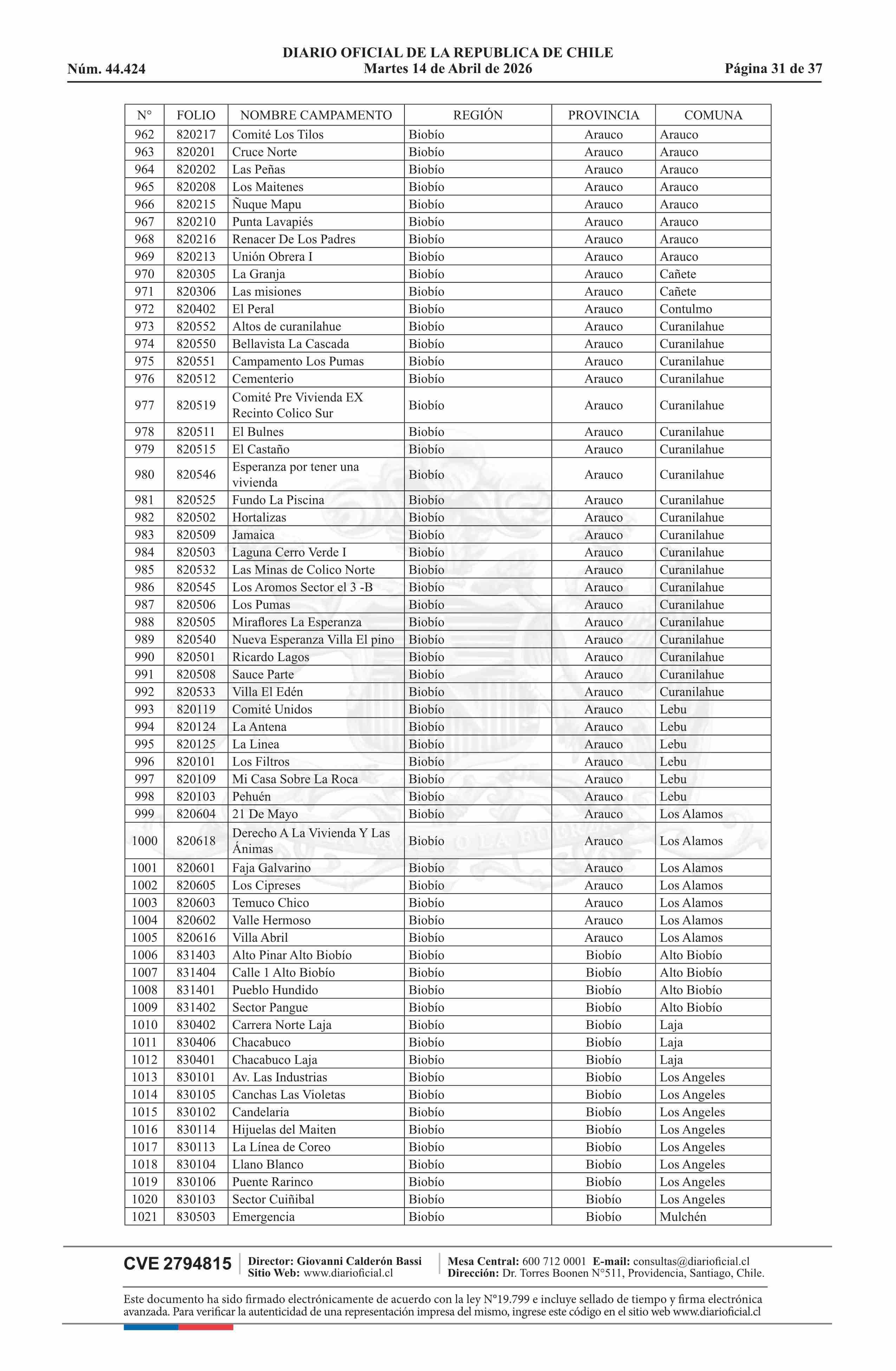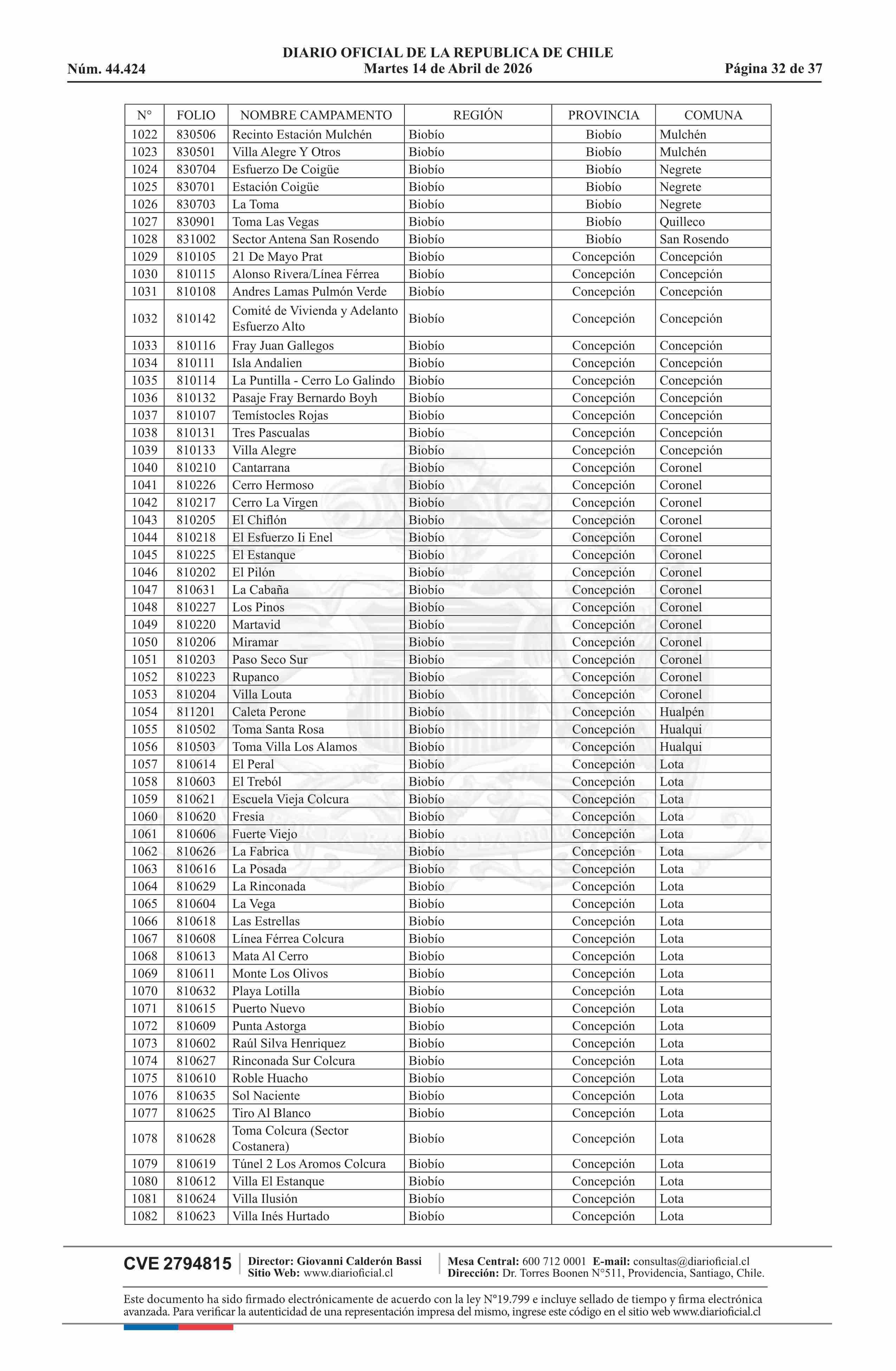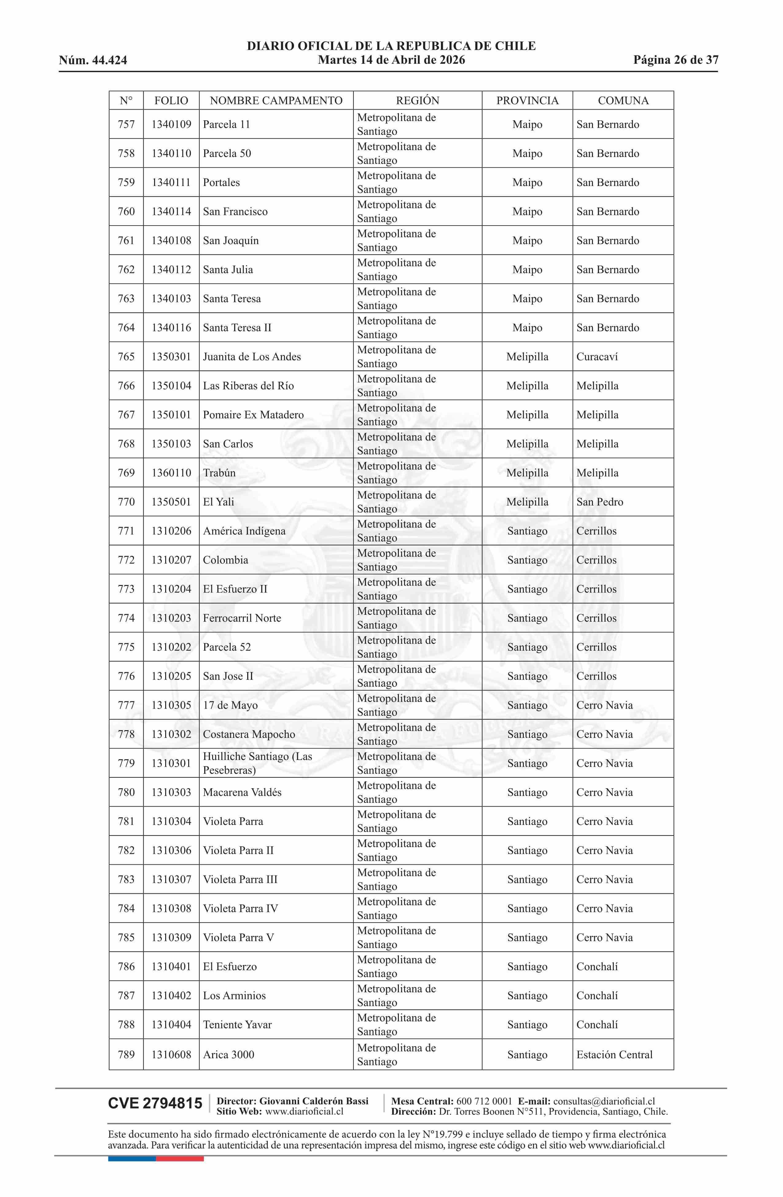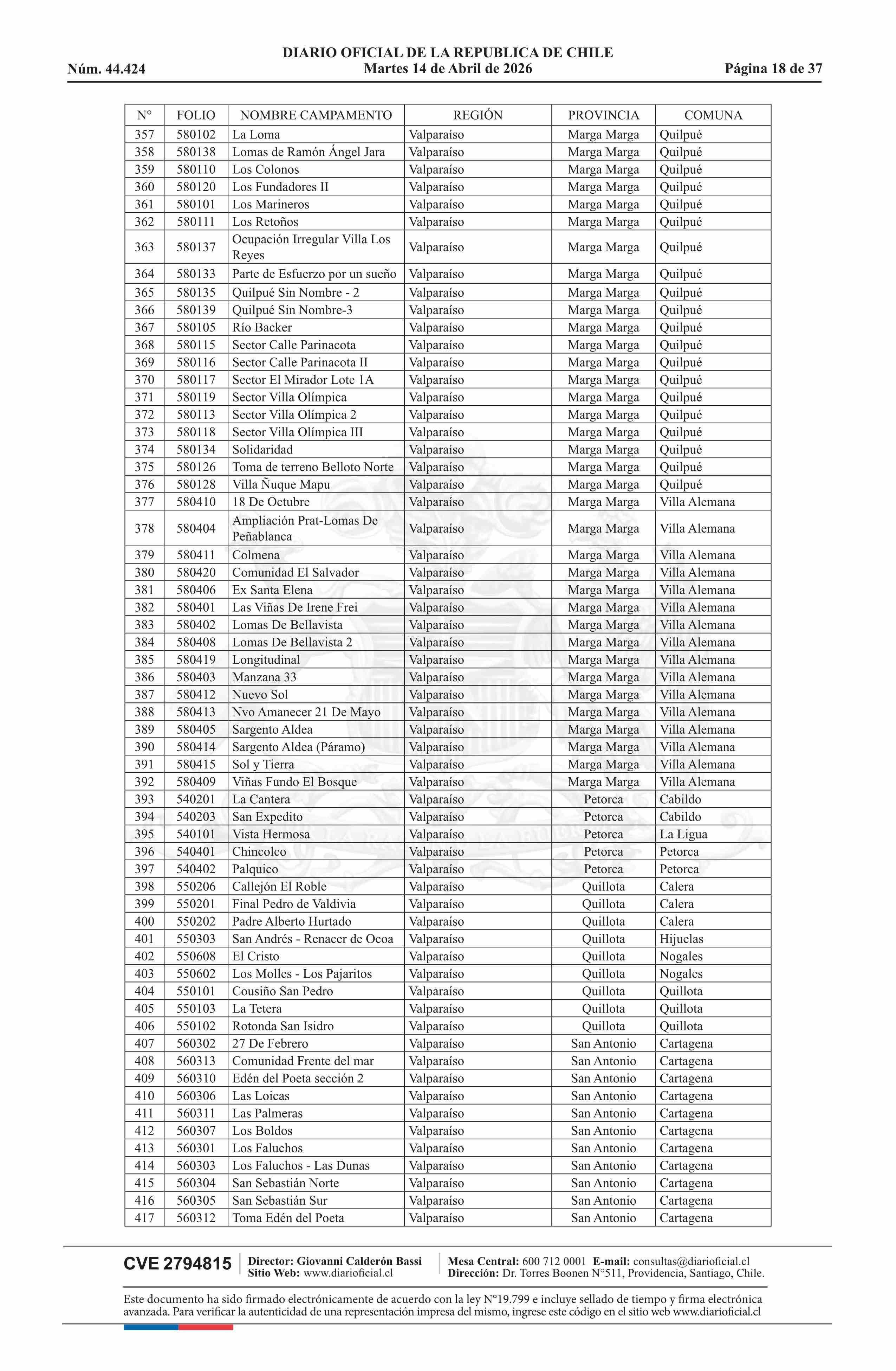 | Título: | Resolución exenta número 377, de 2026.- Aprueba actualización del Registro Histórico de Campamentos y actualización del Registro Vigente de Campamentos, del Catastro de Asentamientos Precarios al 27 de febrero de 2026, y revoca las resoluciones N°s. 335 y 713 exentas, de 2024 |
