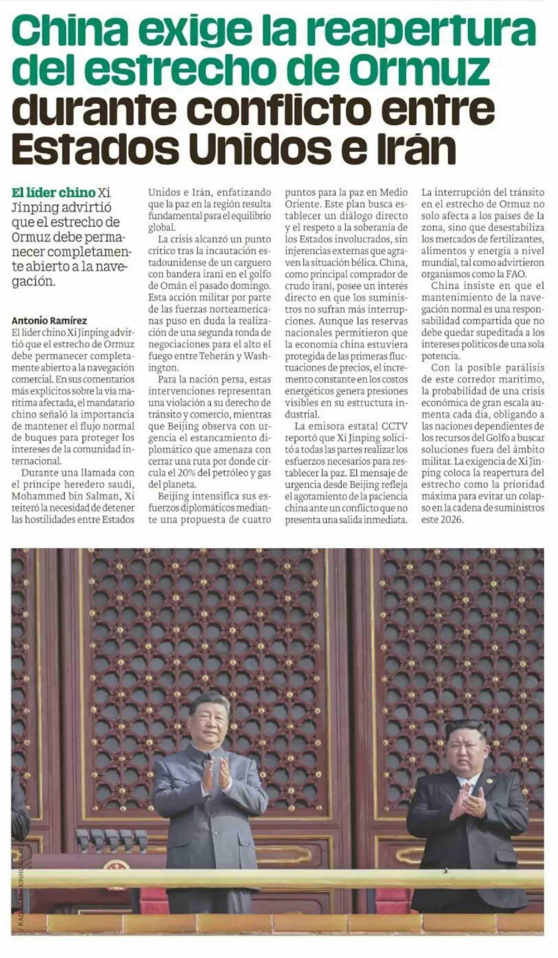 China exige la reapertura del estrecho de ormuz durante conflicto entre Estados Unidos e Irán