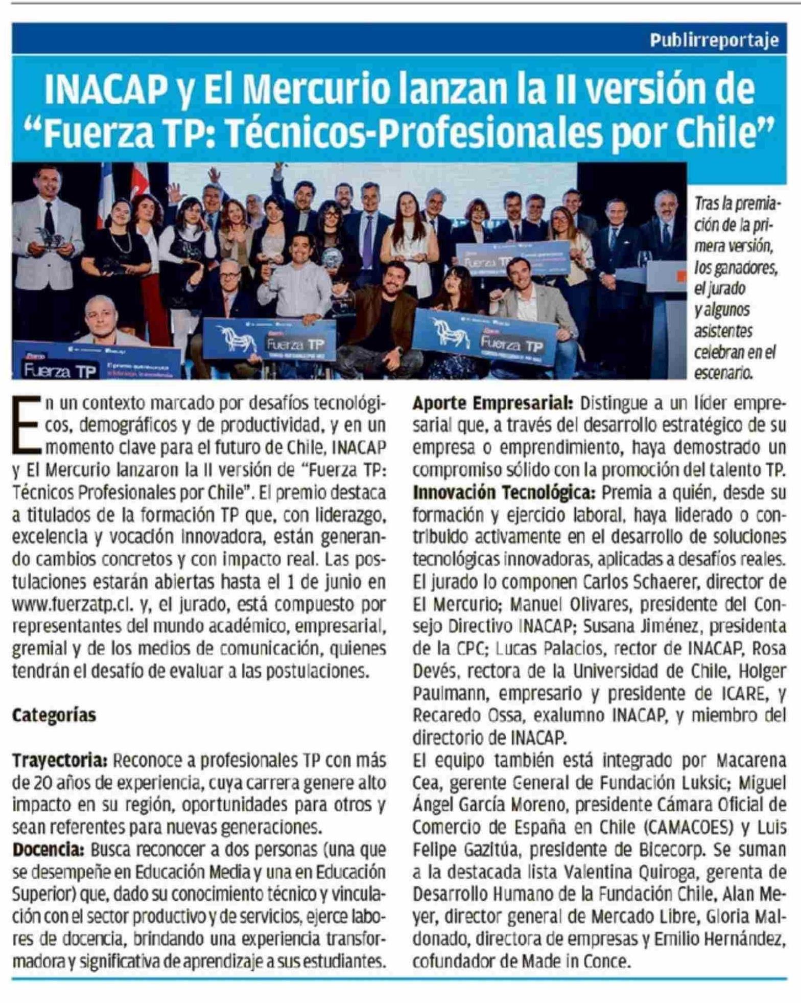 Título: INACAP y El Mercurio lanzan la Il versión de "Fuerza TP: Técnicos-Profesionales por Chile"